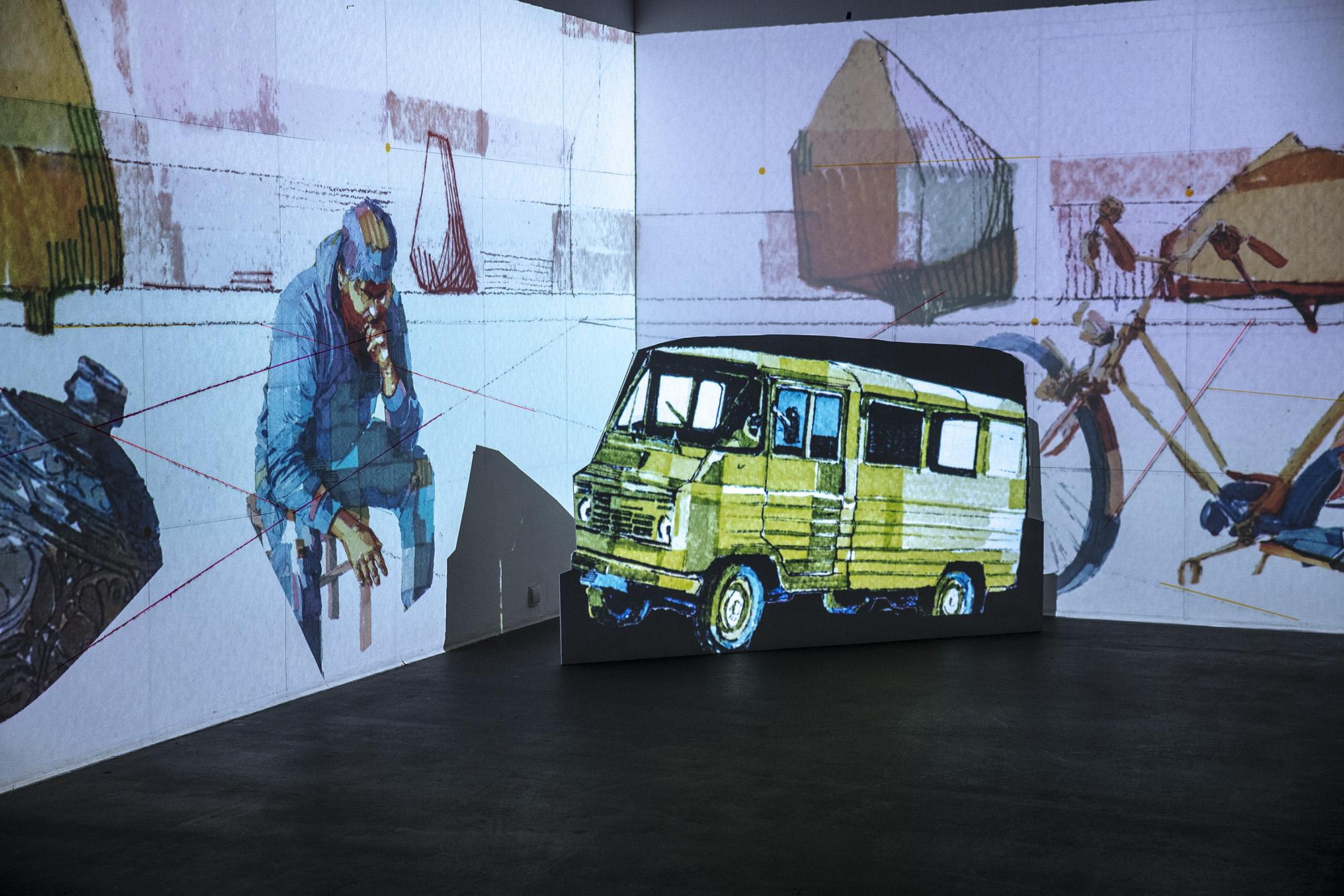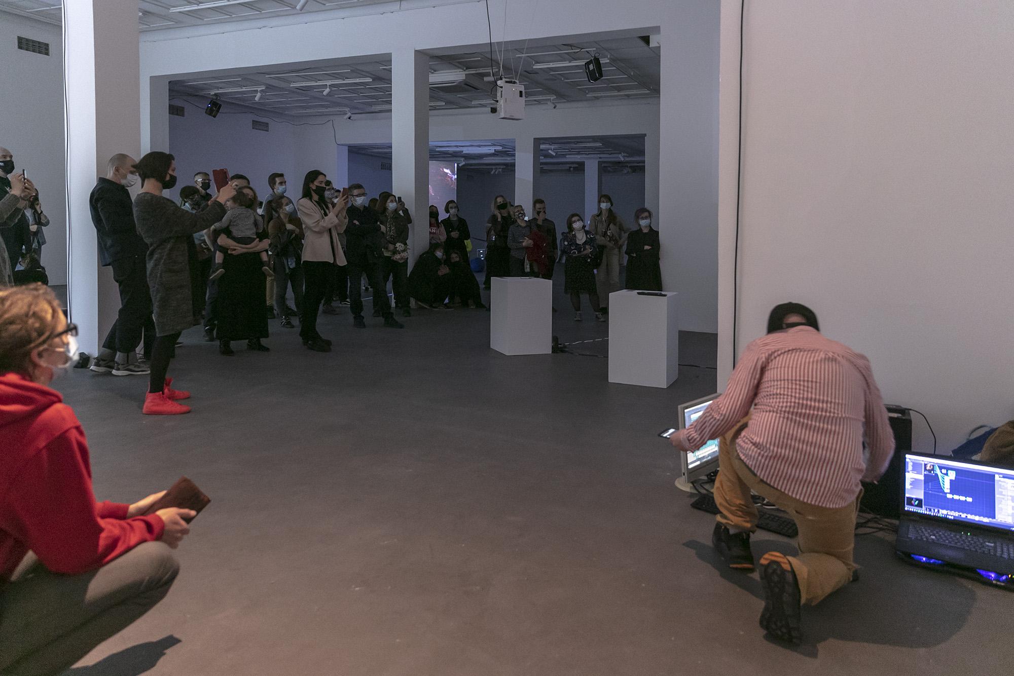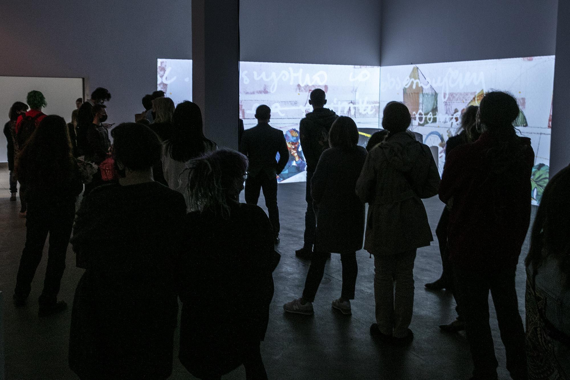 Video mapping in the gallery. The artists expose a symbiosis between the real and virtual worlds. Thanks to digital images, viewers will be presented with an alternative vision of the world, as they find themselves surrounded by an augmented reality.