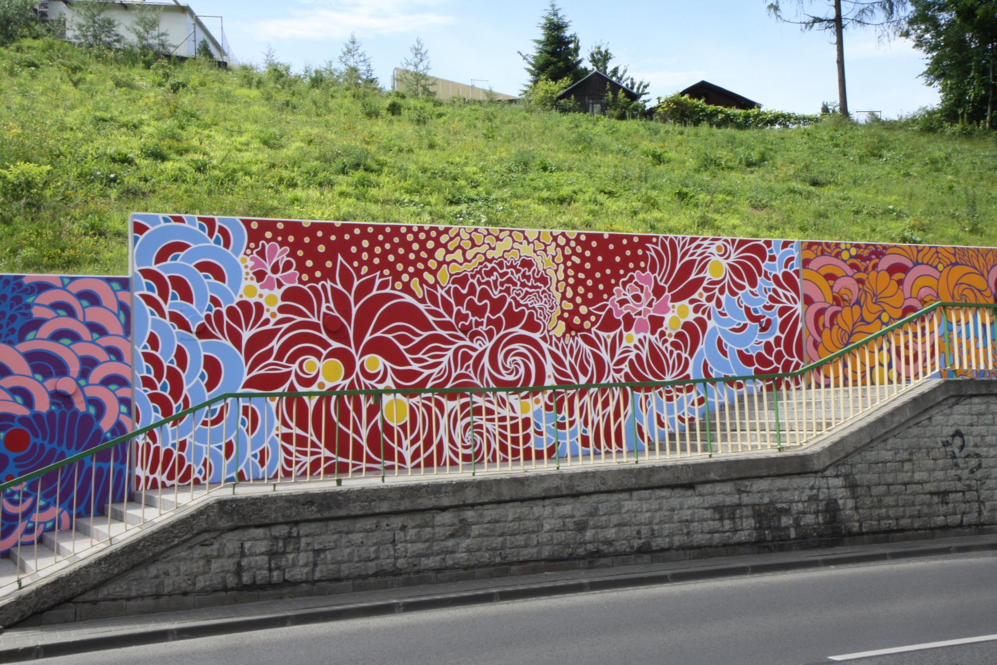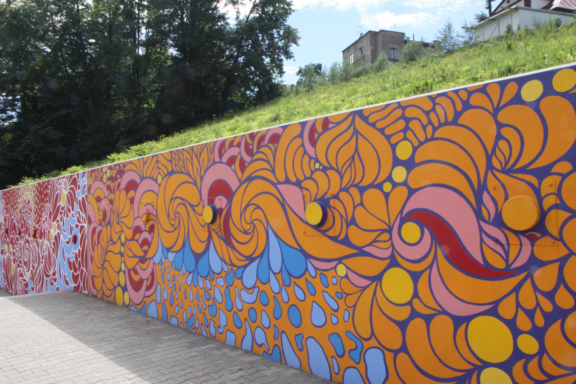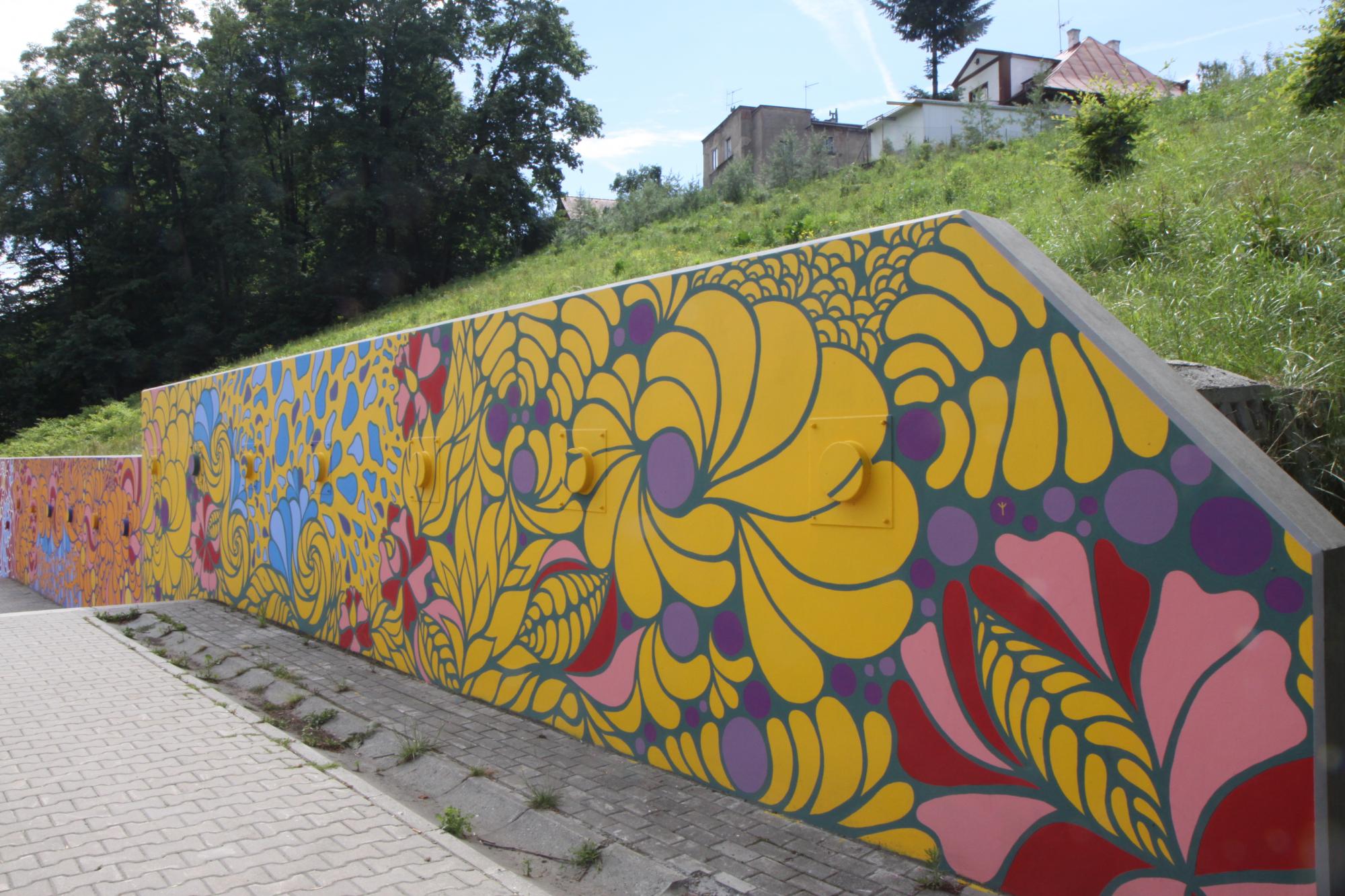 W latach 2014–2015 Izabela Ołdak wykonała mural na ścianie oporowej przy ul. Partyzantów. Tworząc go przy ruchliwej, przelotowej arterii miasta z pozostałościami bielskich fabryk, pomyślała o nasyceniu go bogatą ornamentyką, kolorami i optymizmem.