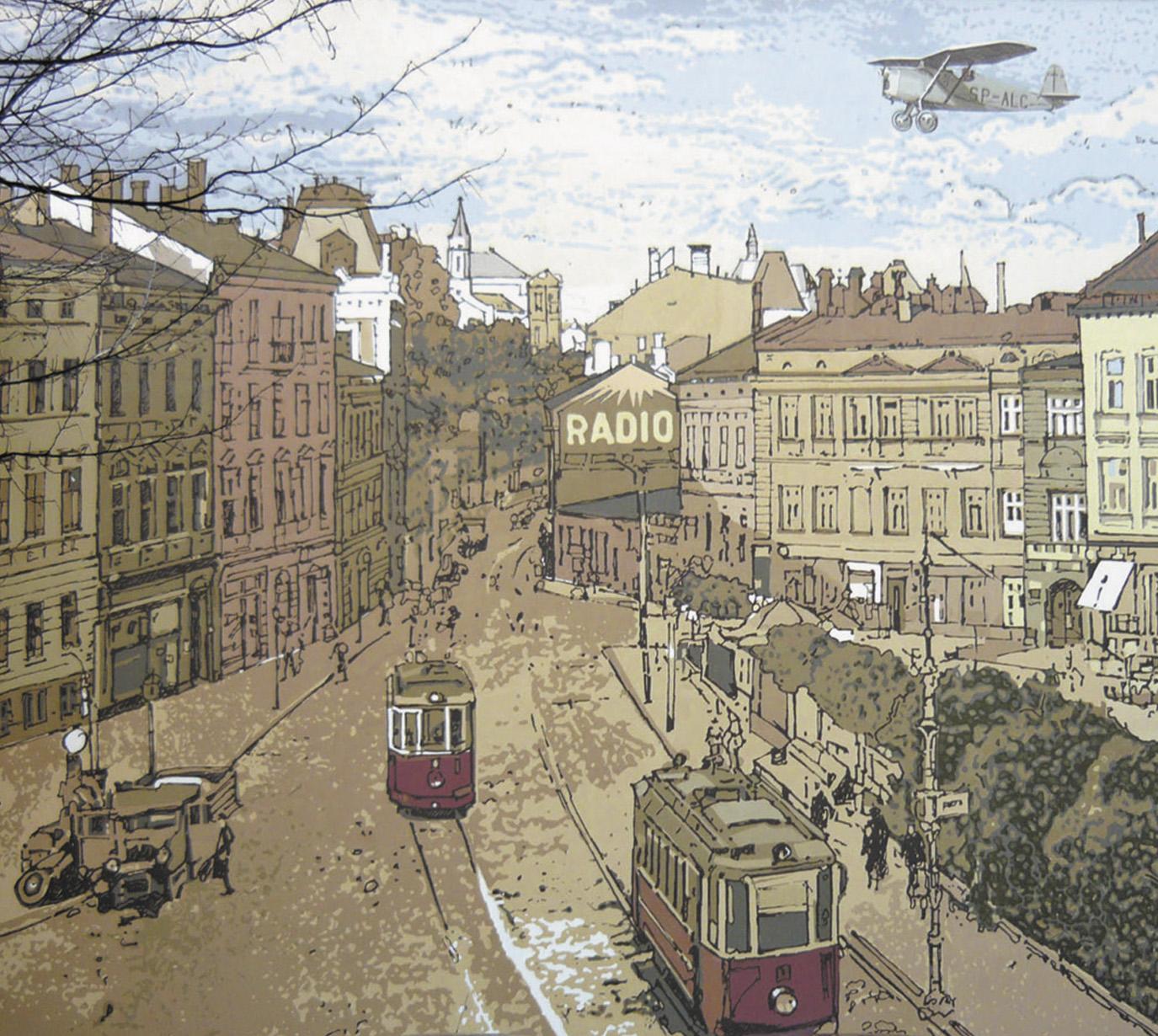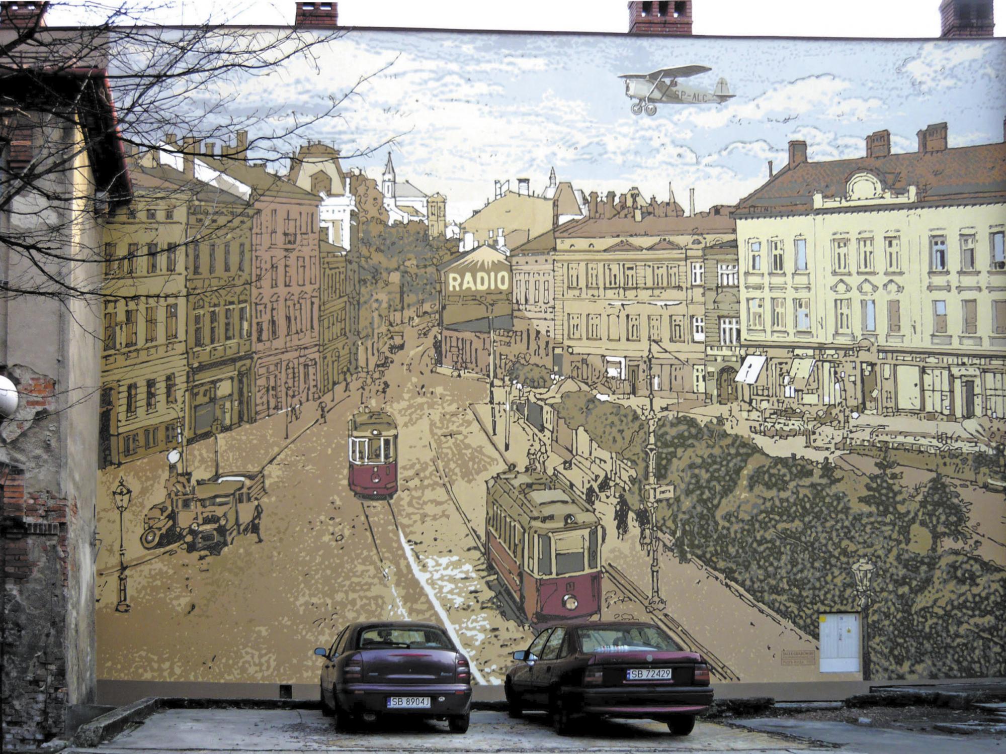 Autorami muralu są bielscy artyści: Jacek Grabowski i Piotr Wisła, którzy inspirowali się w swojej malarskiej wizji starą widokówką Bielska z lat 30. XX wieku. Praca przedstawia widok na ulicę Zamkową i sunący po niej tramwaj. Aby upamiętnić pilotów Franciszka Żwirko i Stanisława Wigurę – patronów placu – na niebie umieszczono samolot RWD.