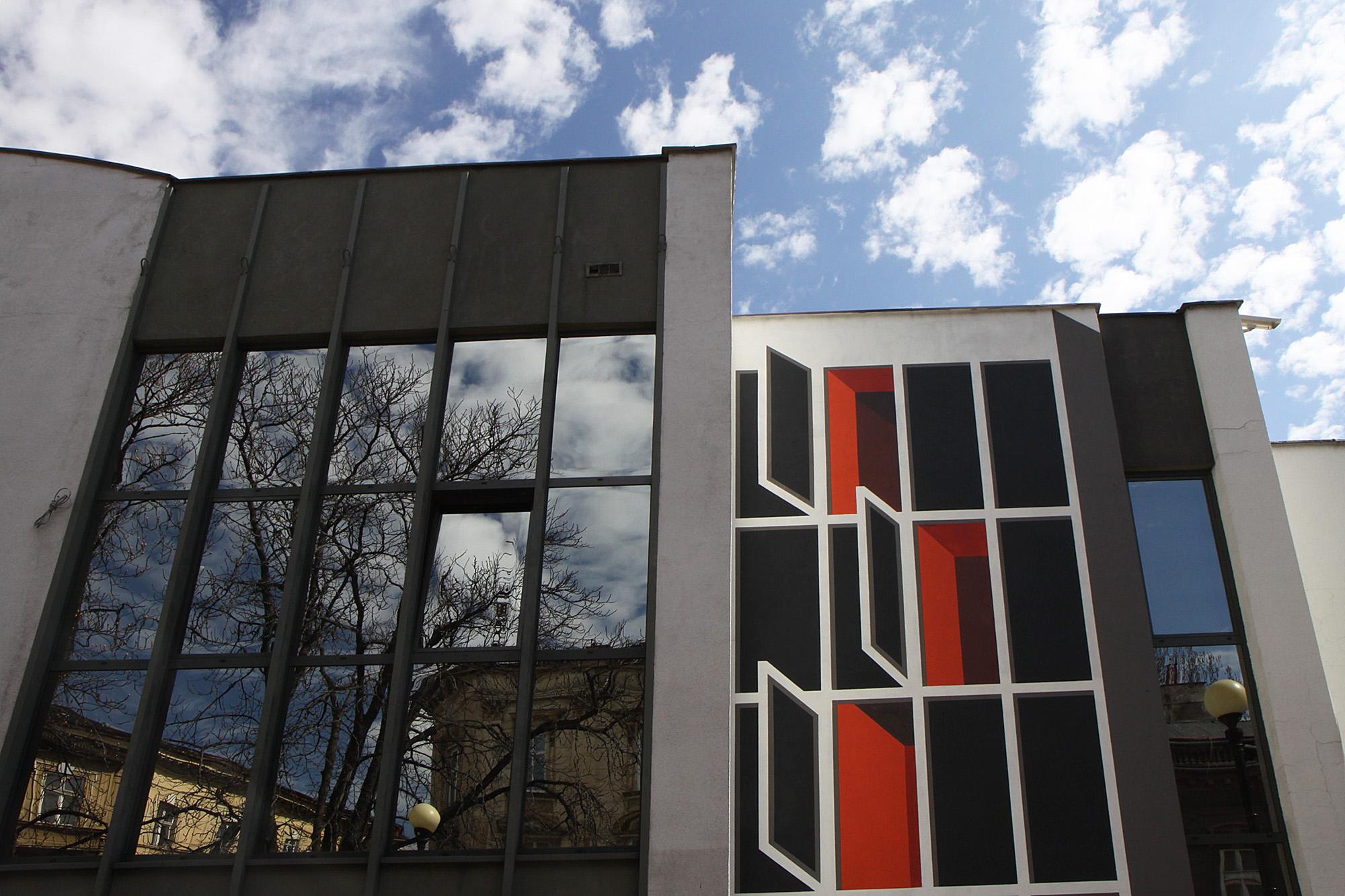 Artystka interesuje się formami geometrycznymi, z których tworzy malarskie iluzje przestrzeni architektonicznych. Mural obrazuje zamianę płaskiej przestrzeni w skomplikowane, trójwymiarowe, przynależące do innej rzeczywistości okna i wnętrze galerii, które kuszą widza swoją intrygującą czerwienią.