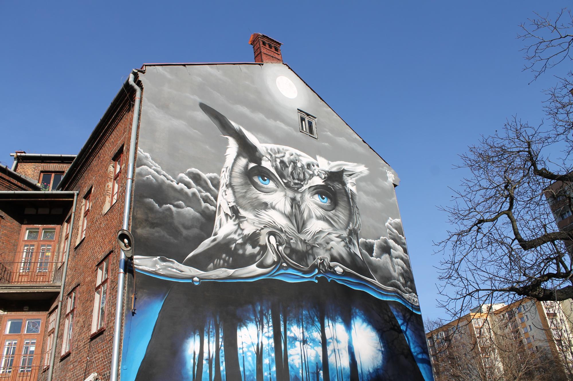 Mural stworzony przez bielskiego artystę, działającego pod pseudonimem Turbos. Przedstawia surrealistyczny wizerunek sowy z ludzkimi oczami, których błękit powielony jest w tajemniczym lesie z niebieską poświatą. Interpretacji tego obrazu może być wiele – sam autor uważa, że można go traktować np. jako metaforę artysty i jego wizji. Mural powstał w pierwszej edycji projektu „oBBraz miasta” w 2014 roku, zorganizowanego przez Fundację Galerii Bielskiej i Galerię Bielską BWA.