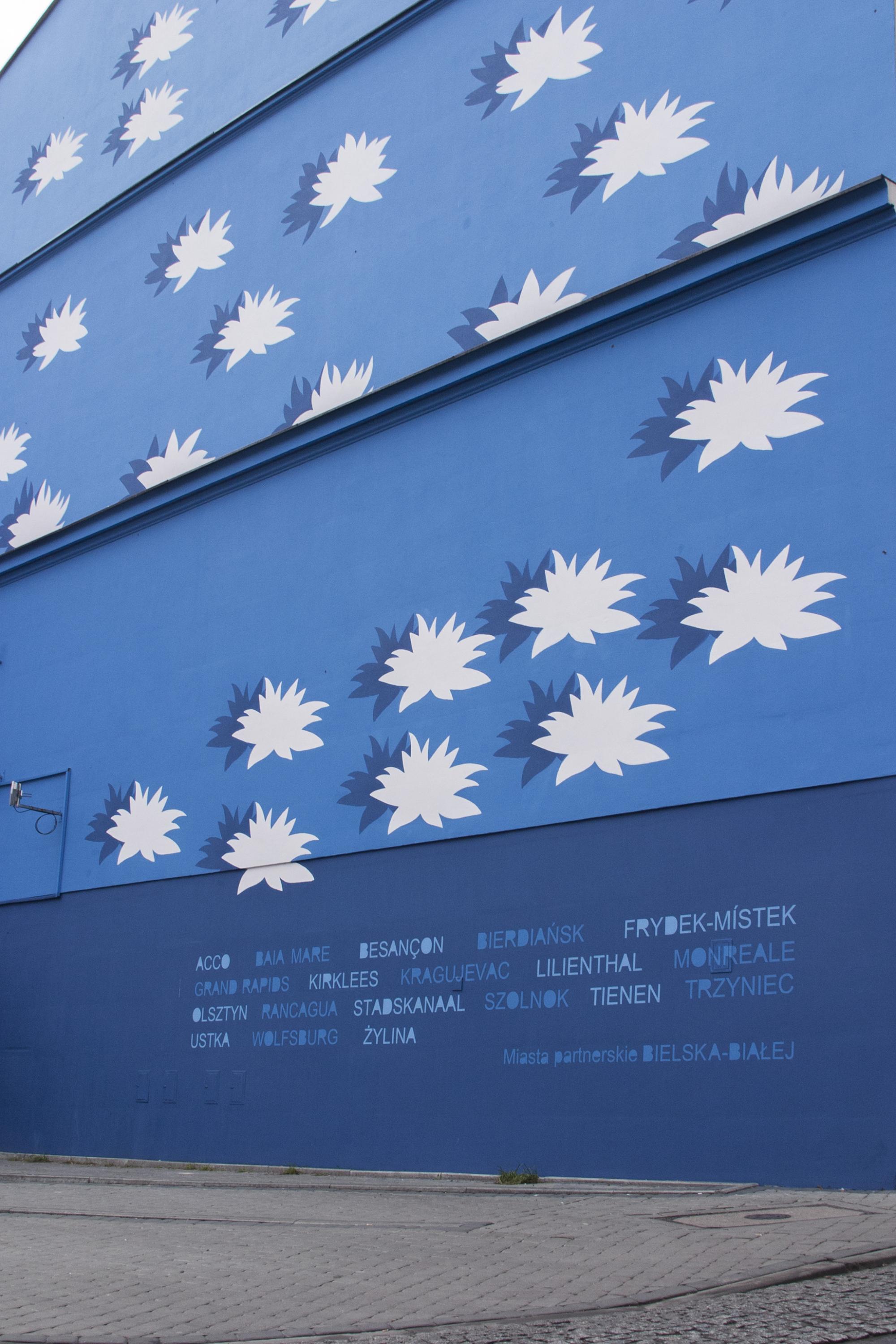 W 2008 roku Joanna Stańko namalowała na ścianie budynku przy ulicy gen. Władysława Sikorskiego białe kwiaty na niebieskim tle. Kwiaty lotosu, umieszczone regularnie w kompozycji, budzą pozytywne skojarzenia z obłokami unoszącymi się na przejrzystym, błękitnym niebie. W dolnej części realizacji zostały wymienione nazwy miast partnerskich Bielska-Białej. Projektując mural, artystka chciała wprowadzić więcej intensywnych kolorów w przestrzeń miejską, a także stworzyć charakterystyczny punkt w mieście, będący odtąd miejscem spotkań. Praca powstała w programie akcji artystycznej Galerii Bielskiej BWA o tytule „Prze/mieszczanie malarstwa”.