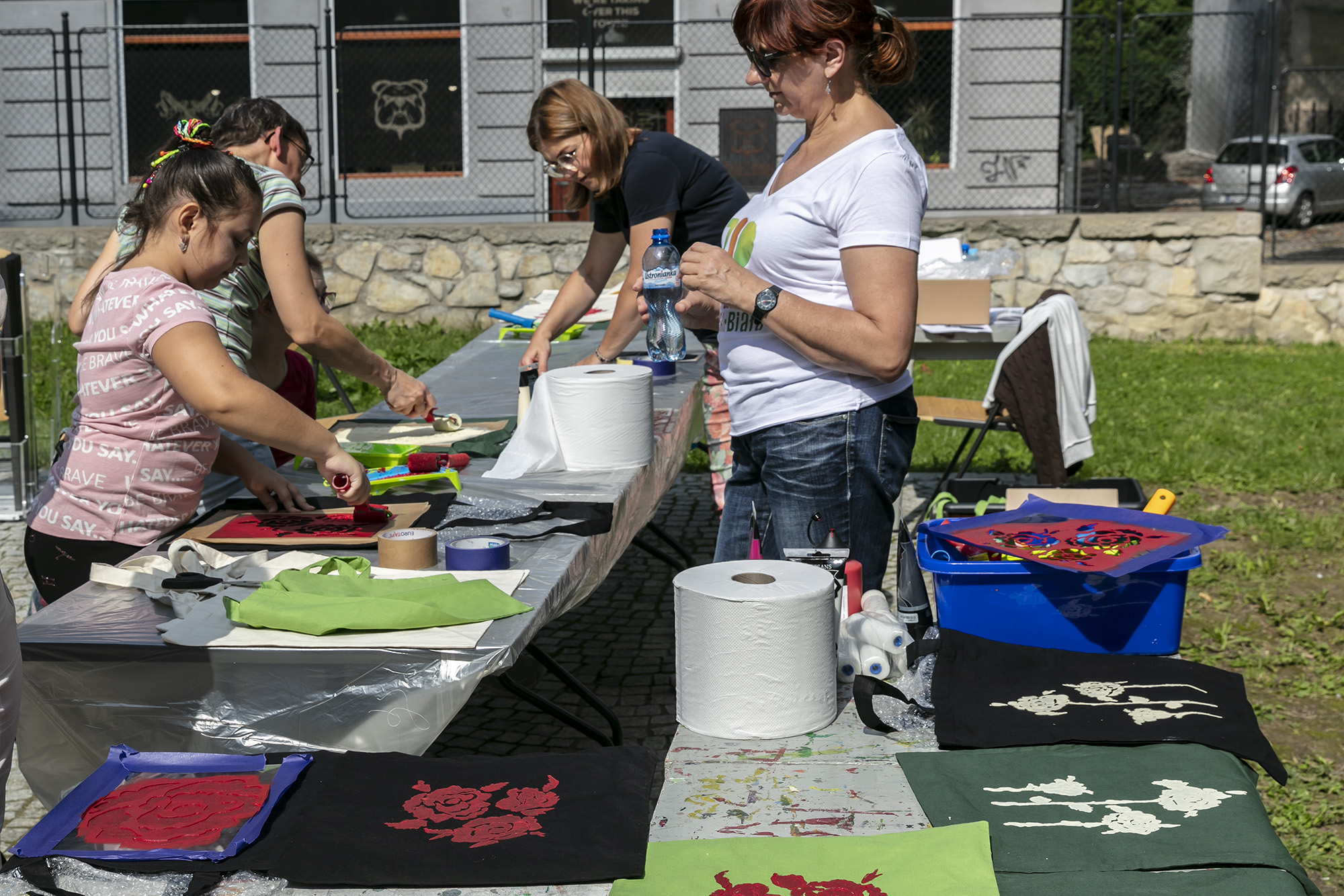 Warsztaty plastyczne dla dzieci: odbijanie szablonów z motywem róży na koszulkach i torbach.