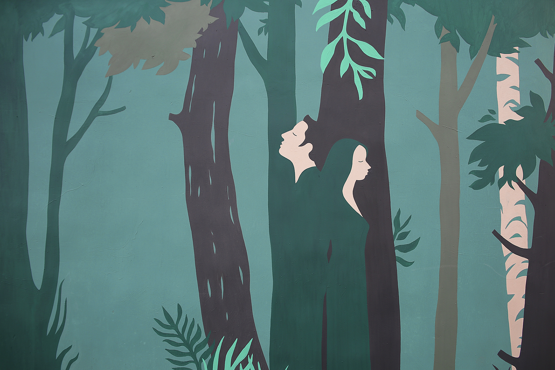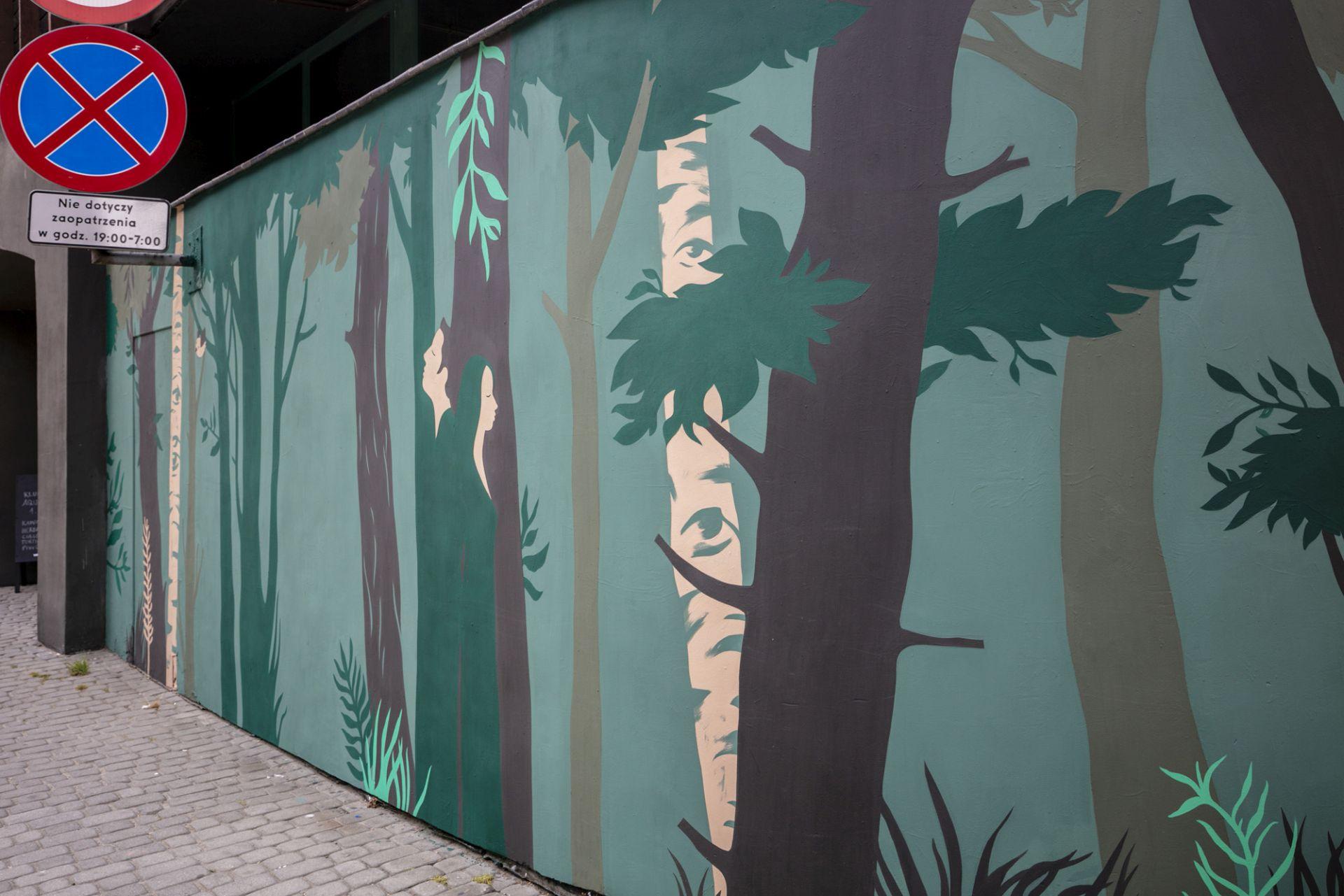 Elementem muralowej narracji, która z czasem się ujawni, są także ludzie, zrośnięci z drzewami, wsłuchani, medytujący w ich otoczeniu czy obejmujący je w geście drzewoterapii. Symbolika drzewa ma tu jeszcze dodatkowe znaczenie w kontekście miejsca, mocnego ukorzenienia, ugruntowania i silnych związków natury z kulturą.