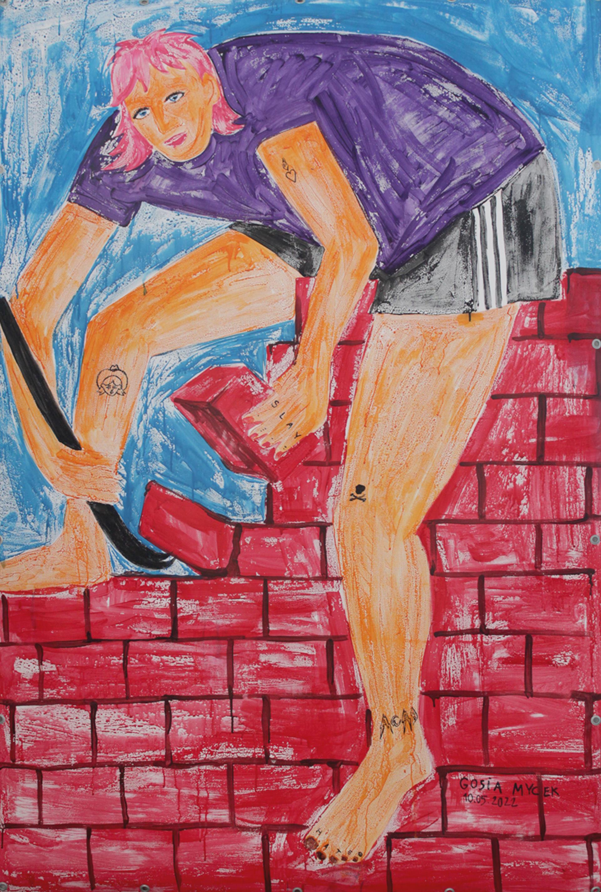 Małgorzata Mycek – osoba artystyczna i aktywistyczna, nawiązując do motywów odbudowy znanych z malarstwa socrealistycznego, tworzy monumentalny tryptyk malarski przedstawiający trzy bohaterki rozbierające mury. Prace przedstawiają burzenie granic dzielących ludzi i politycznych oponentów. Artysta odwołuje się do idei odbudowy świata po upadku patriarchatu. Swoje obrazy najczęściej maluje na banerach reklamowych. W swojej praktyce artystycznej Mycek bada wątki peryferii oraz polskiej wsi, z której sam się wywodzi. Pokazuje codzienne sytuacje i osoby bohaterskie. W projektach artysty wybrzmiewa zainteresowanie oddolnymi inicjatywami, queerem, feminizmem oraz strategiami emancypacyjnymi.