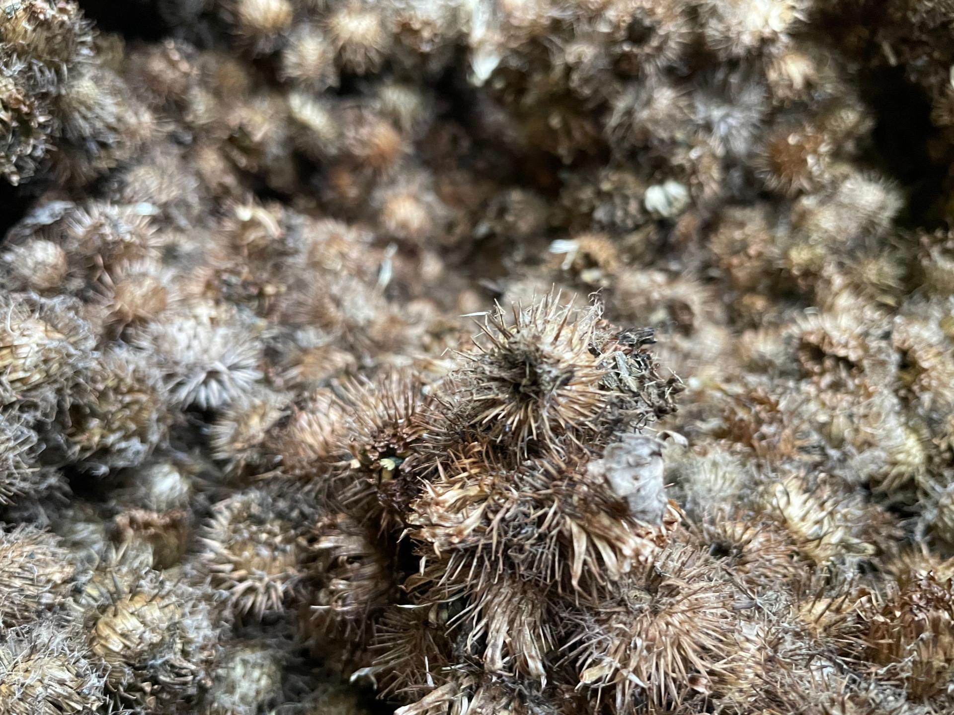 Pamela Bożek jest autorką rzeźby pokazywanej na wystawie, wykonanej z owocostanów łopianu większego, której kształt jest intencjonalnie zmienny i która powstaje wciąż od nowa, wykorzystując fizyczne przystosowanie w ramach strategii migracji rośliny – łączenia się ze sobą kulistych niełupek wyposażonych w haczykowate włoski. Łopian większy (Arctium lappa) wędruje wczepiony w ciała zwierząt i ludzi, używając ich jak wehikułów, podróżuje, by zasiedlać nowe tereny. W polskiej tradycji ludowej Arctium lappa nazywany jest łopuchem, dziadem i rzepem; jest rośliną obecną w praktykach leczniczych i magicznych, korzeń był jadalny w czasach głodu. Rzep – owocostan, kulista niełupka porośnięta haczykowatymi włoskami, rzucany we włosy w akcie złośliwości, jest prawie niemożliwy do usunięcia, wczepia się czyniąc wszystko co miękkie i przyjemne boleśnie drażniącym, dokuczliwym i przykrym. Po zakończeniu wystawy, nasiona łopianu większego pochodzącego z terenu Mazur Garbatych, które wysypią się w procesie powstawania rzeźby, zostaną rozsiane na terenie Bielska-Białej.