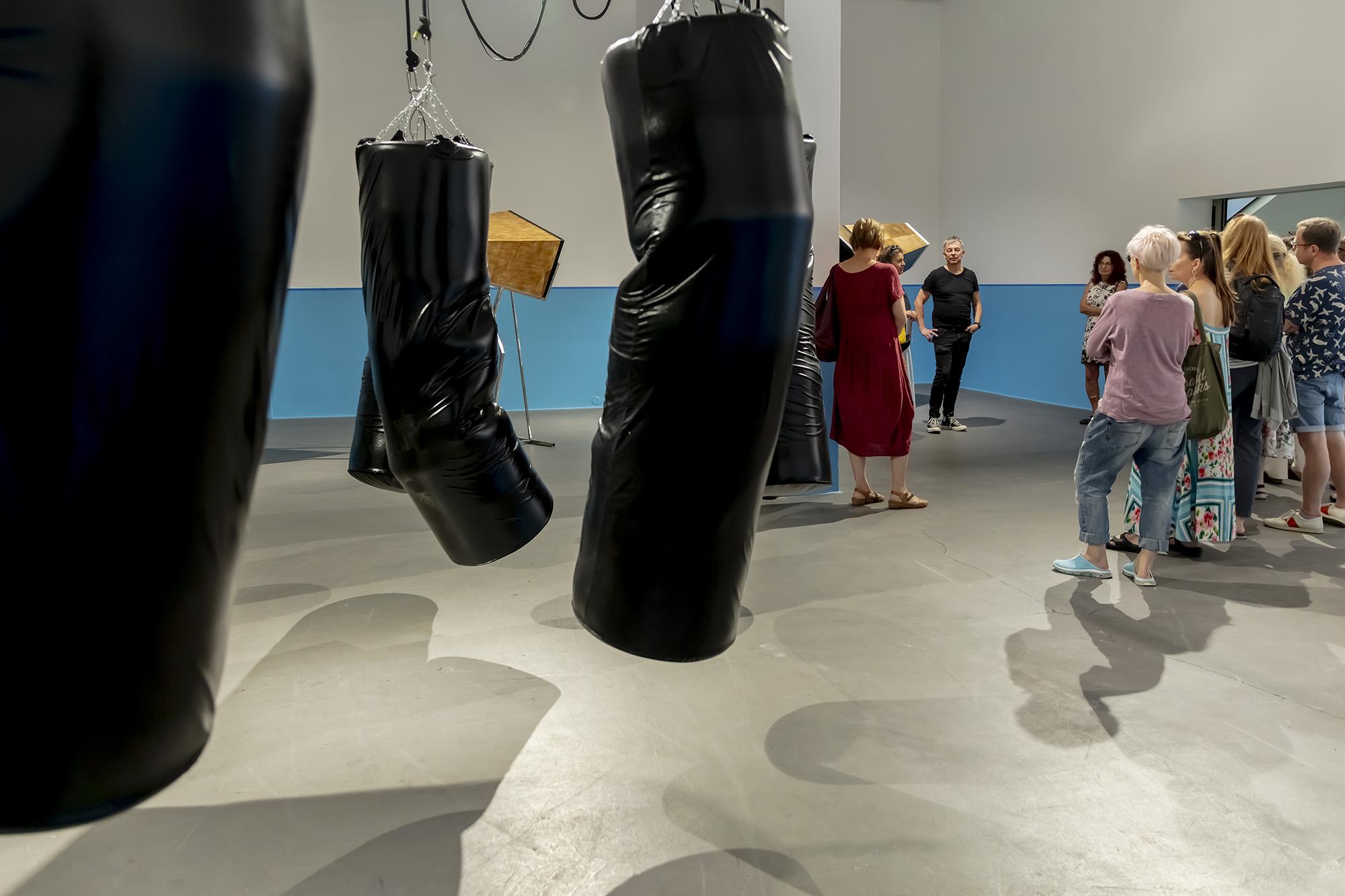 Z kolei instalacja kinetyczna „Worki treningowe” ożywia bokserskie worki treningowe, które niczym ludzkie ciało oddychają, kulą się od przyjmowanych ciosów.