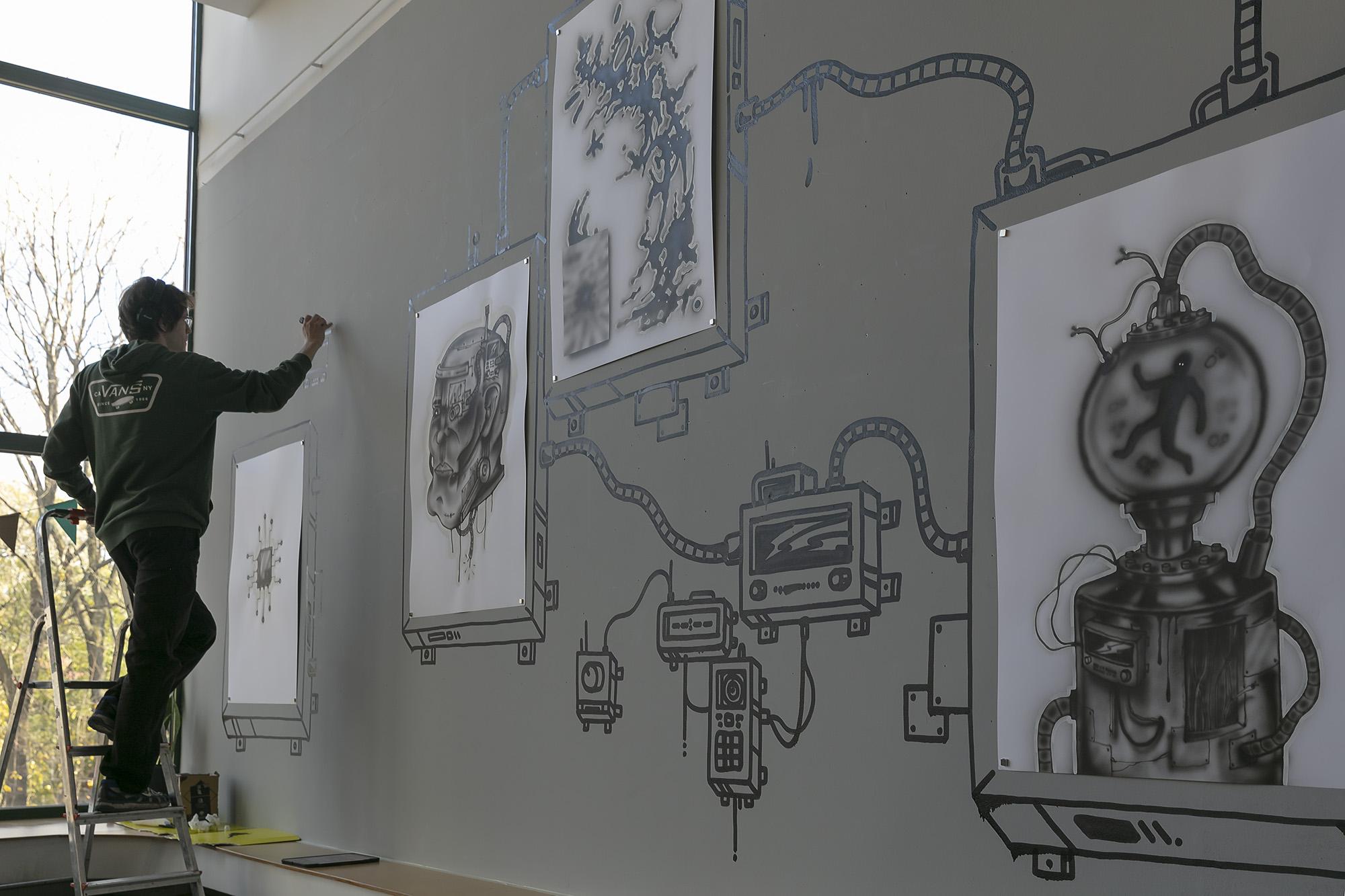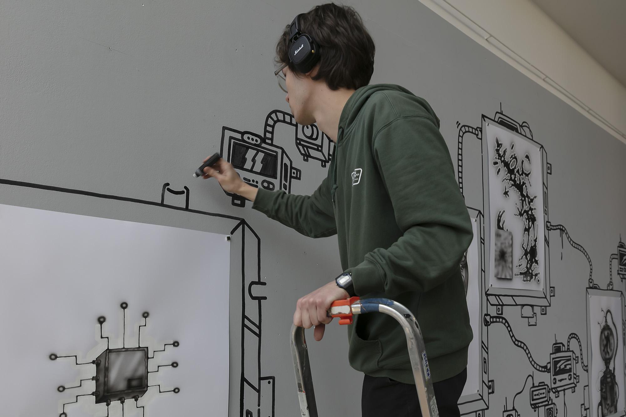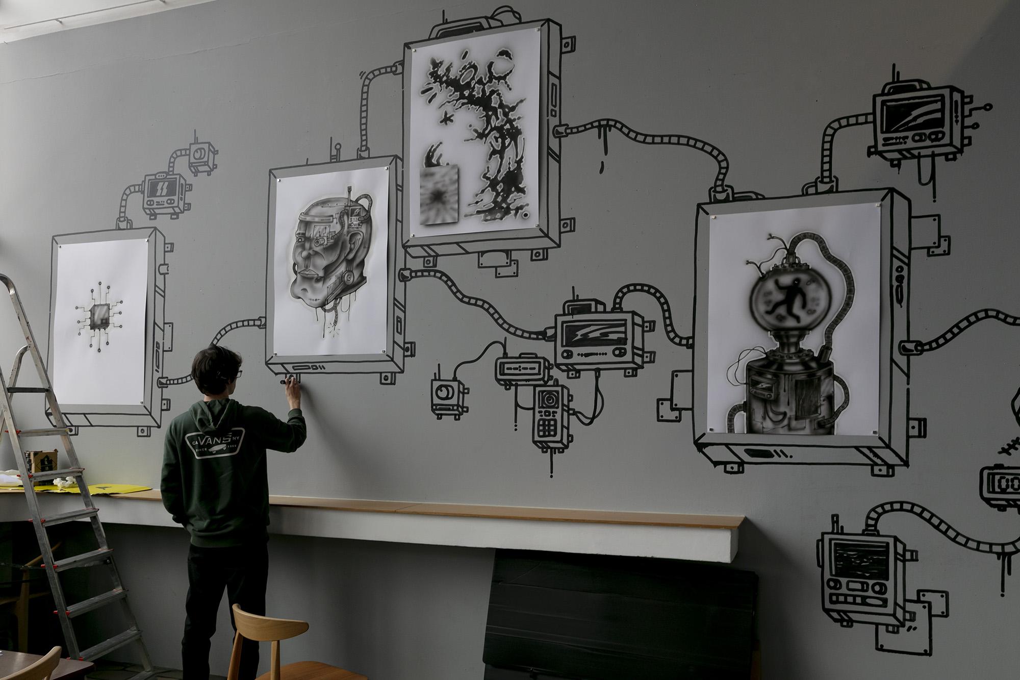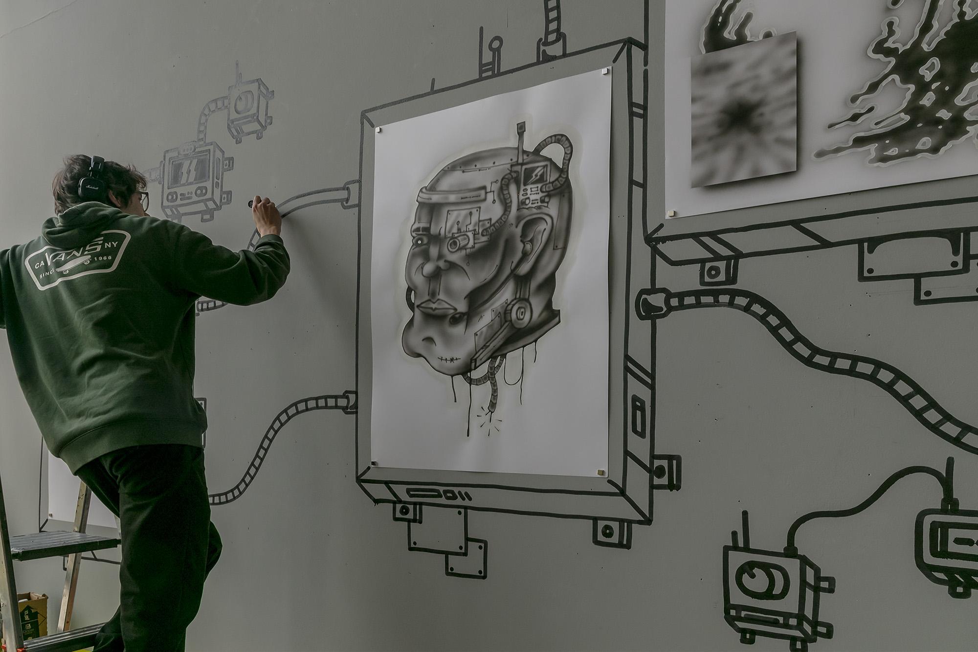 Bielski artysta w trakcie realizacji wystawy – rysunkom towarzyszy graficzny mural wykonany markerem bezpośrednio na ścianie.
