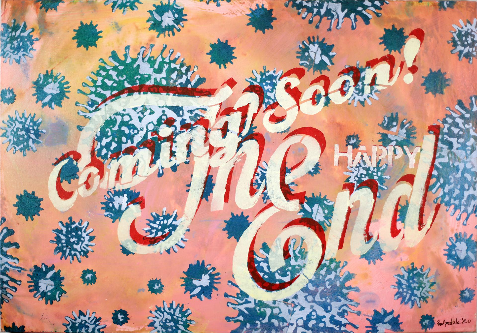 Tytułowy obraz to adaptacja komiksowego motywu. Komiksy to w końcu nieustające źródło inspiracji Jarodzkiego. Zarówno jeśli chodzi o narrację – szczególnie tu istotny był ich undergroundowy, niezależny nurt – jak też jeśli chodzi o formalne zakomponowanie ścian galerii. Napis „Świat nie istnieje” wpisany został przez artystę w winietę zapożyczoną ze słynnego “Gotham Globe”, gazety obnażającej występki upadłego miasta grzechu z graficznych powieści o Batmanie. Multiplikacje z tym motywem przeglądają się na wystawie w obrazach z cyklu “Coming Soon: The End”. Seria mikroskopowych zbliżeń groźnego wirusa SARS-coV-2 mieni się od kolorów. To obrazy, które powstały podczas dwuletniego okresu lockdownu, spowodowanego przez epidemię, będącą kolejnym dobitnym dowodem na skutki antropopresji, zagrażającej od dziesięcioleci przetrwaniu naszego gatunku.