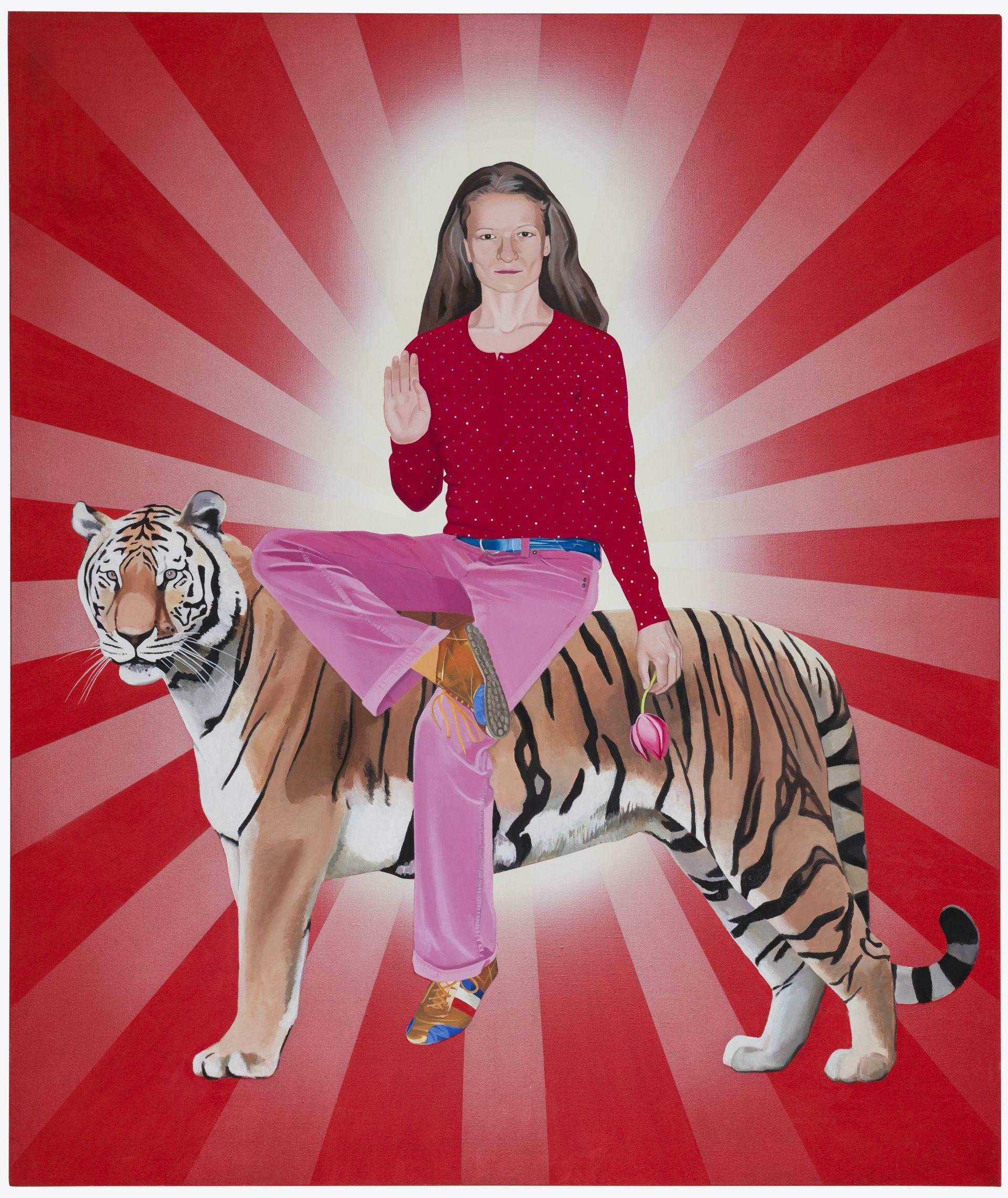 Współcześnie kobiety mają nieporównywalnie więcej możliwości samorealizacji. Ich równouprawnienie, nie do pomyślenia w XIX wieku, daje im nie tylko prawa wyborcze, prawo współdecydowania o polityce i gospodarce. Zmusza je do konkurowania z mężczyznami, do ciągłej walki i konfrontowania sił. Taką wojowniczką jest „Durga” (2008) Malwiny Rzoncy. Artystka sportretowała samą siebie jako hinduistyczną boginię dosiadającą tygrysa. To uwspółcześniona wersja wizerunku niezwyciężonej w boju wojowniczki, walczącej z demonami. W hinduskich wyobrażeniach Durga występuje jako bogini wieloręka, trzymająca atrybuty, dzięki którym zwyciężyła demona Mahiszasura; w autoportrecie artystka zostawiła sobie tylko kwiat (tulipana, w Indiach jest to kwiat lotosu) i pozę z założoną jedna na drugą nogą oraz wyciągniętą w uspokajającym geście dłonią. Zza postaci wyłania się jasna aura oraz promienie układające się jak mandorla w boskich wizerunkach.