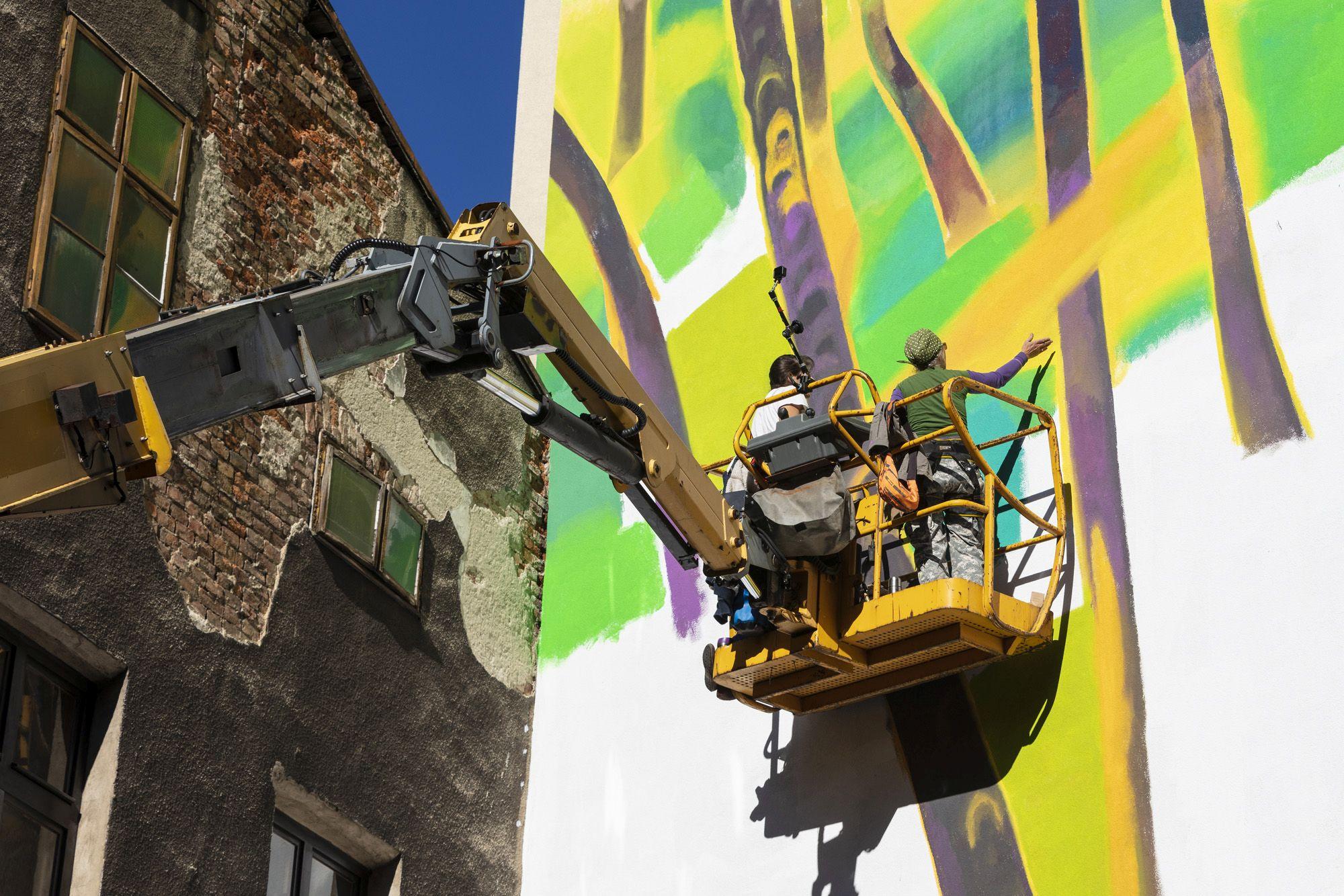 Na zdjęciu: Ewa Ciepielewska podczas realizacji muralu w Bielsku-Białej, 6.10.2020, fot. Krzysztof Morcinek