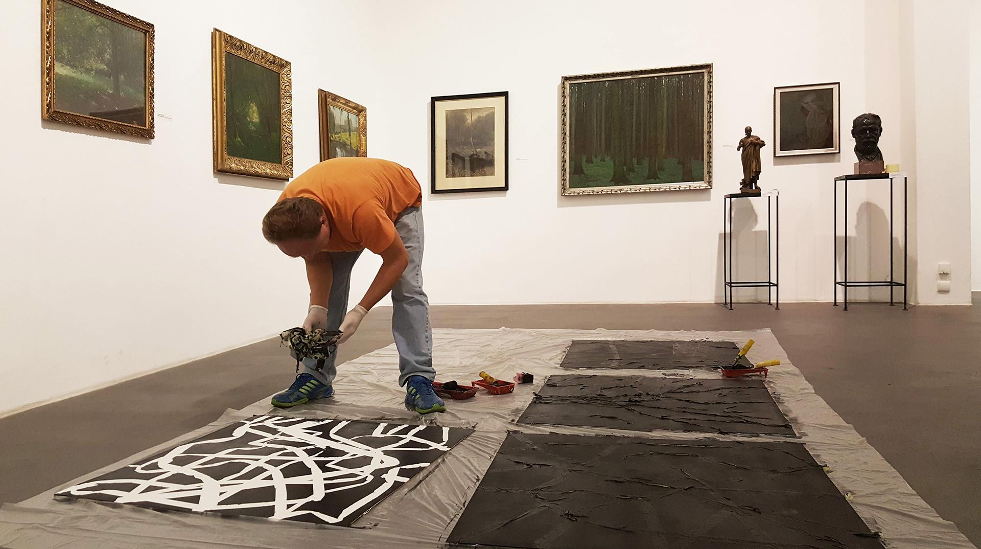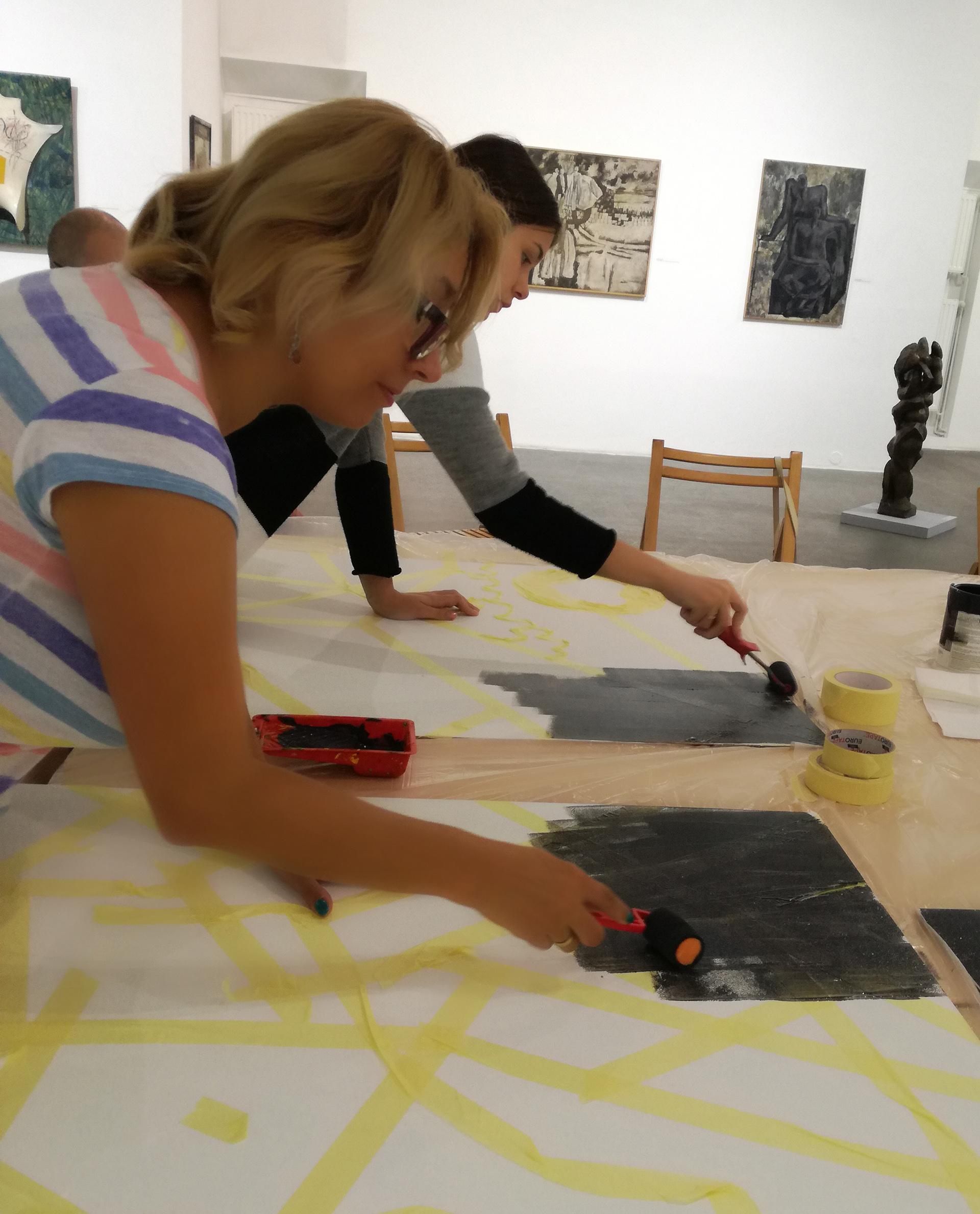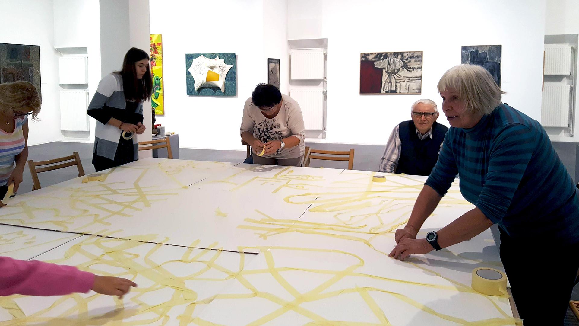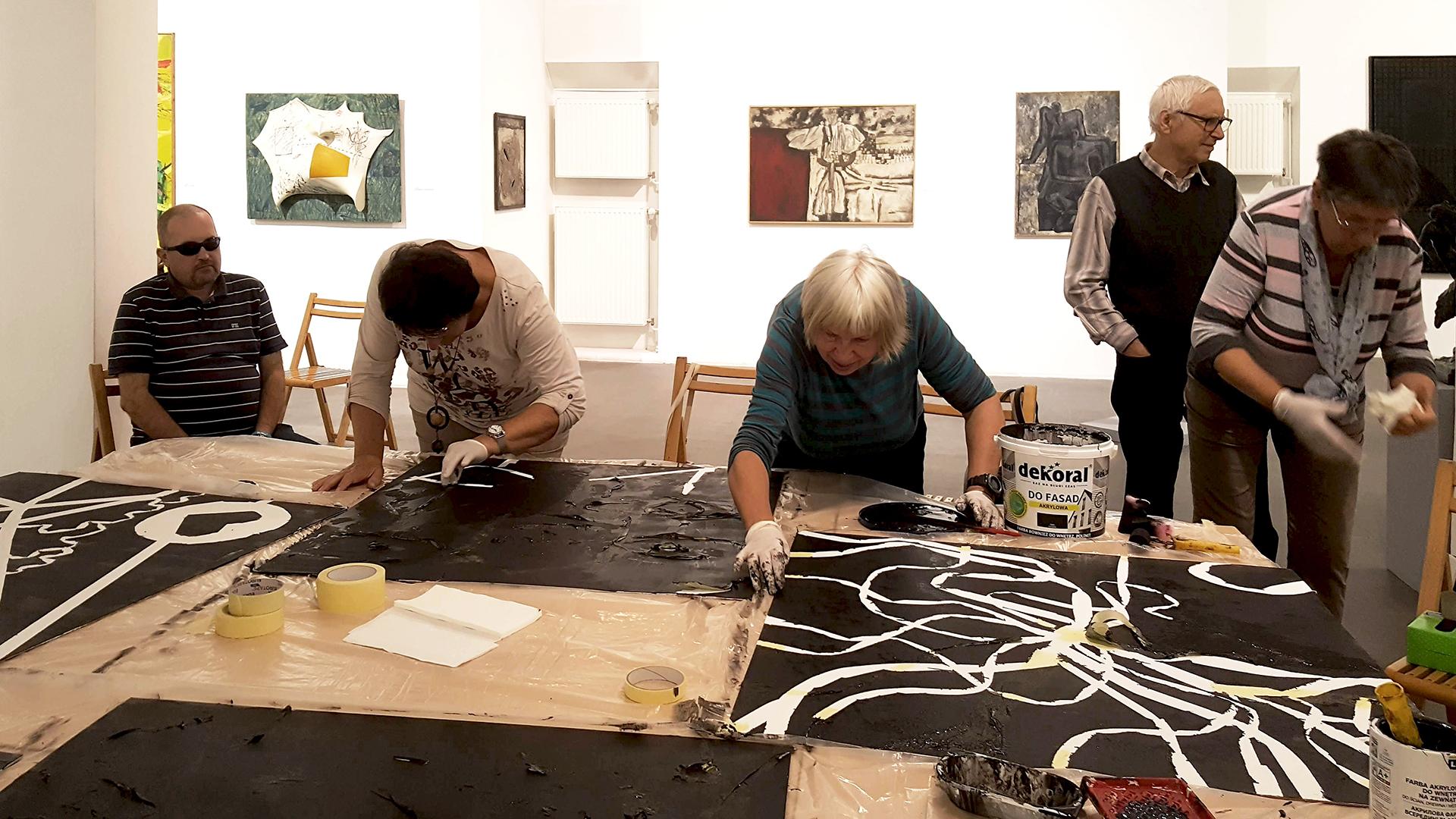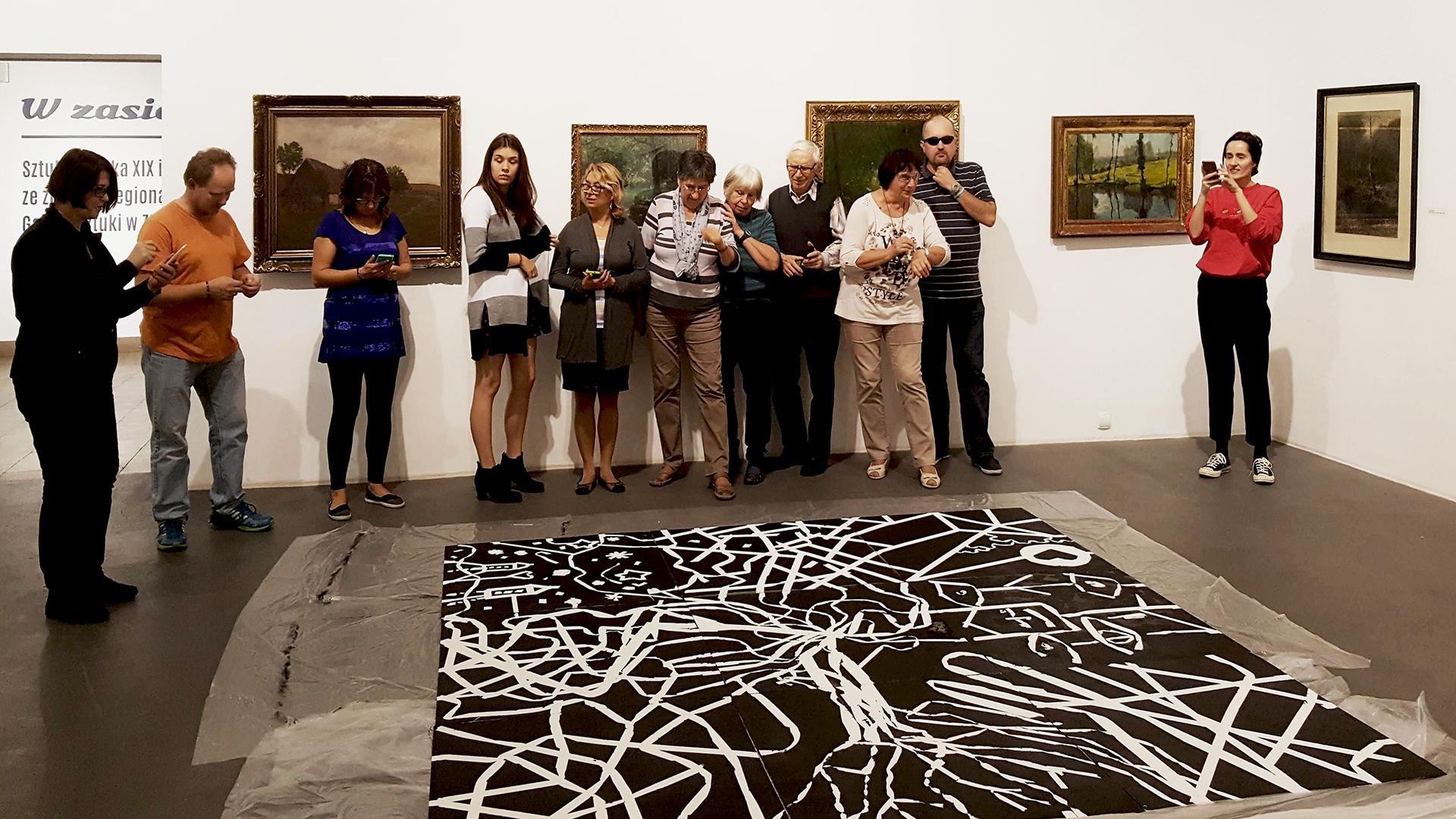 Podczas kilkugodzinnej sesji warsztatowej powstała modułowa kompozycja o wym. 270 x 270 cm. Jej twórcami były osoby niewidome i słabowidzące, stąd też kolorystykę pracy ograniczono do dwóch silnie skontrastowanych ze sobą barw: bieli i czerni. Do stworzenia rysunku została wykorzystana taśma malarska o różnych szerokościach, doskonale wyczuwalna pod palcami, plastyczna, pozwalająca wykreślać różne wzory, których początek wyznaczały punkty umieszczone na brzegach kwadratów. Kolejnym etapem było malowanie tła wałeczkami czarną akrylową farbą. Po wysuszeniu i usunięciu taśmy na gładkiej powierzchni ukazywał się rysunek utworzony z meandrów białych linii.