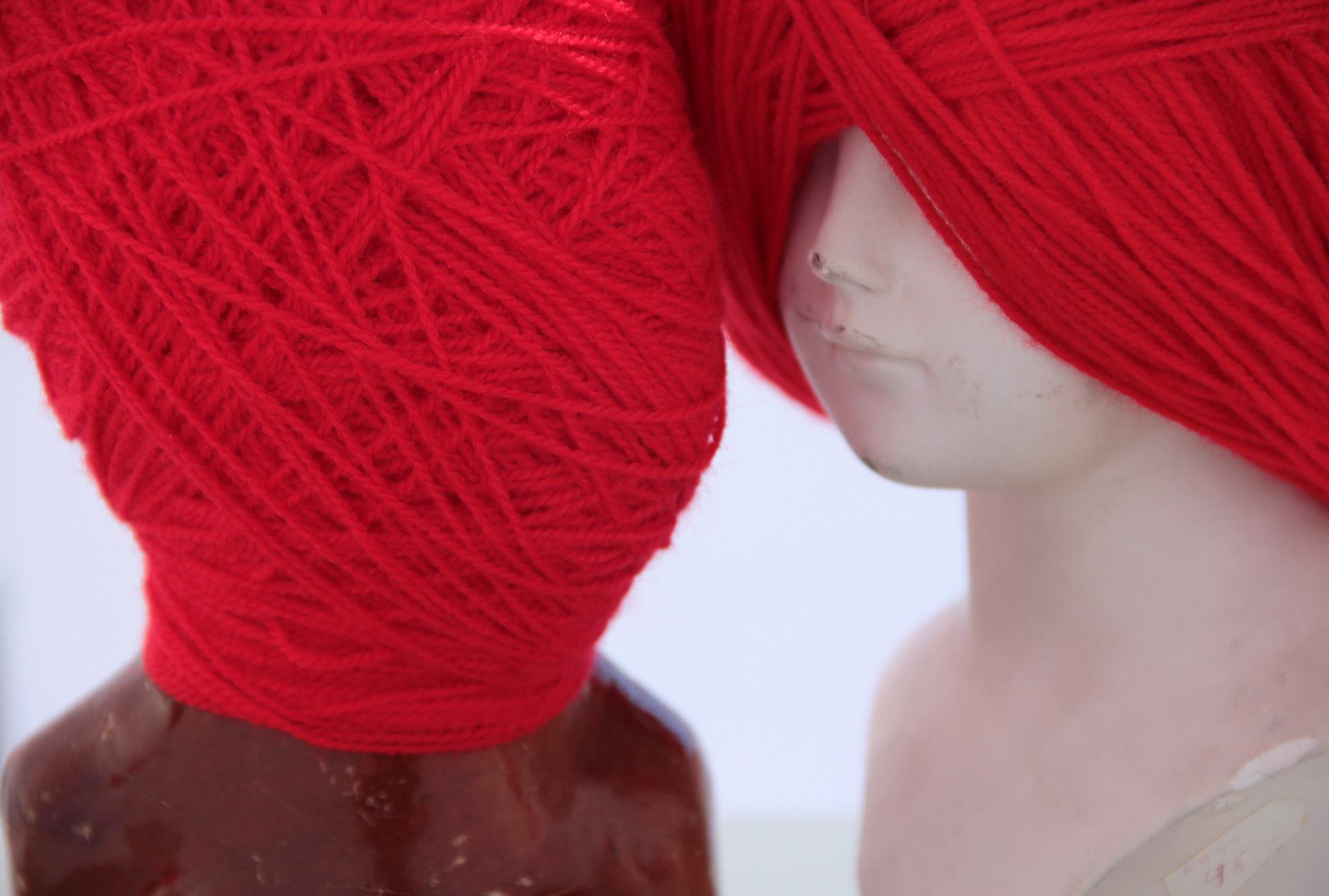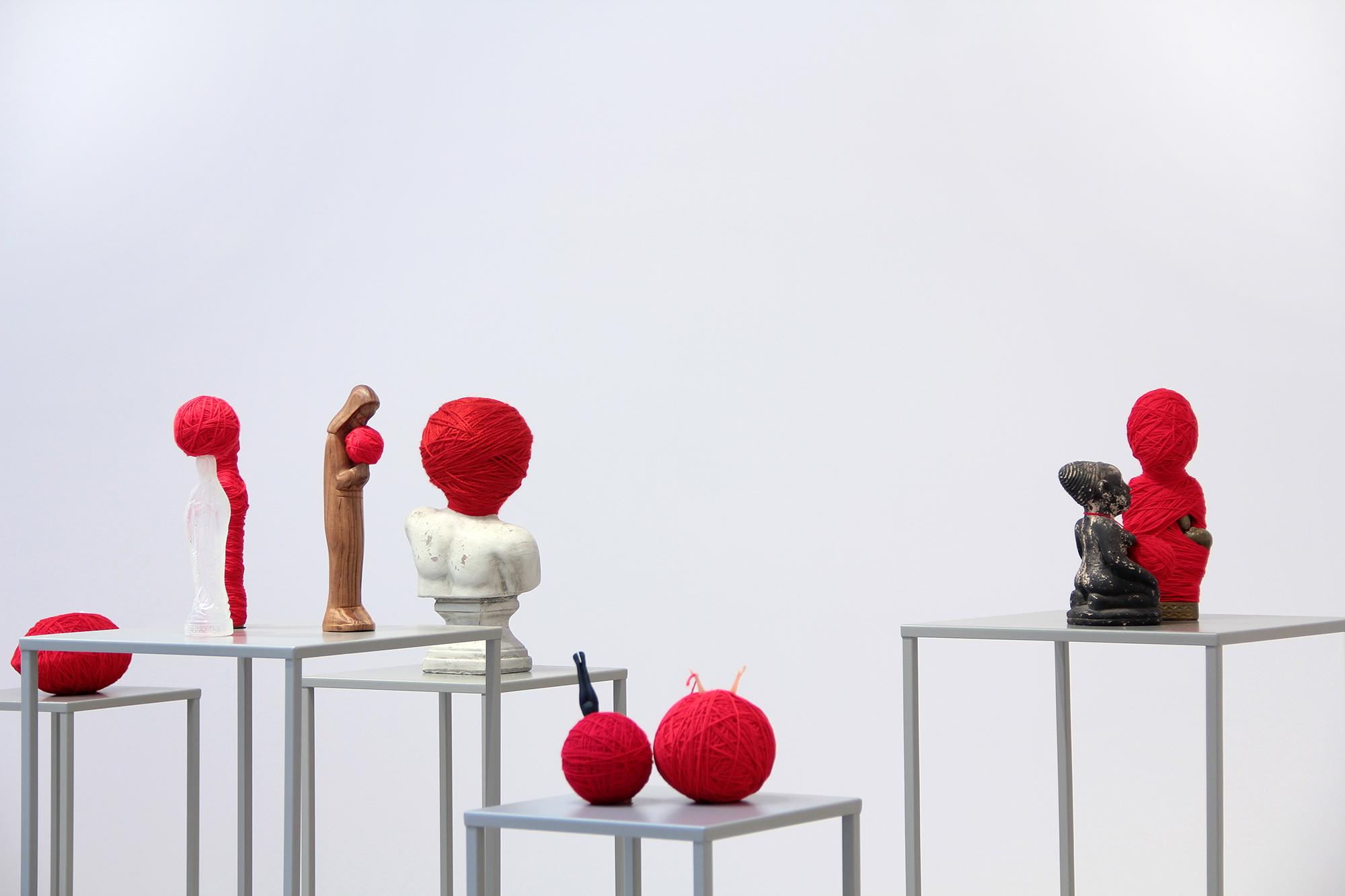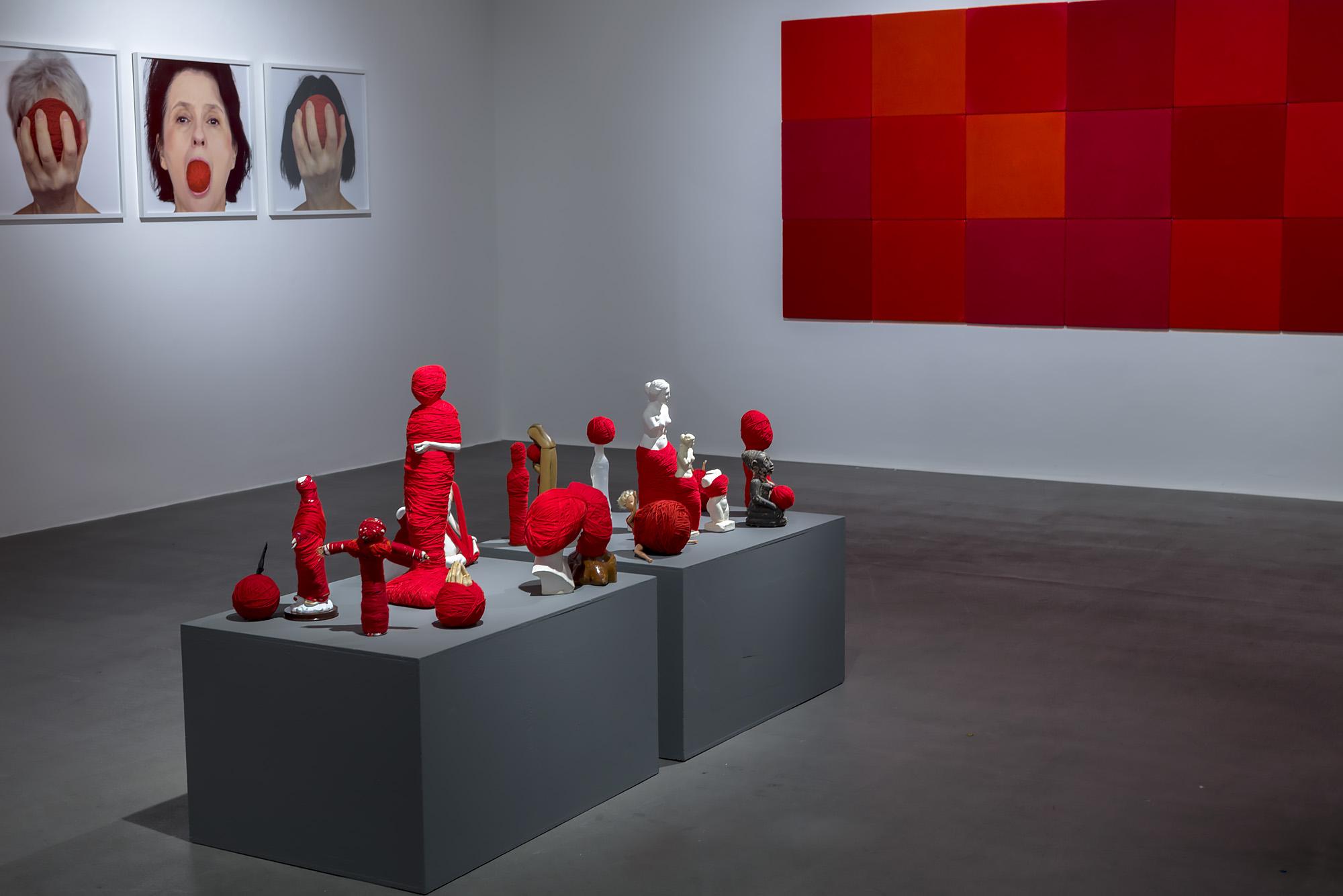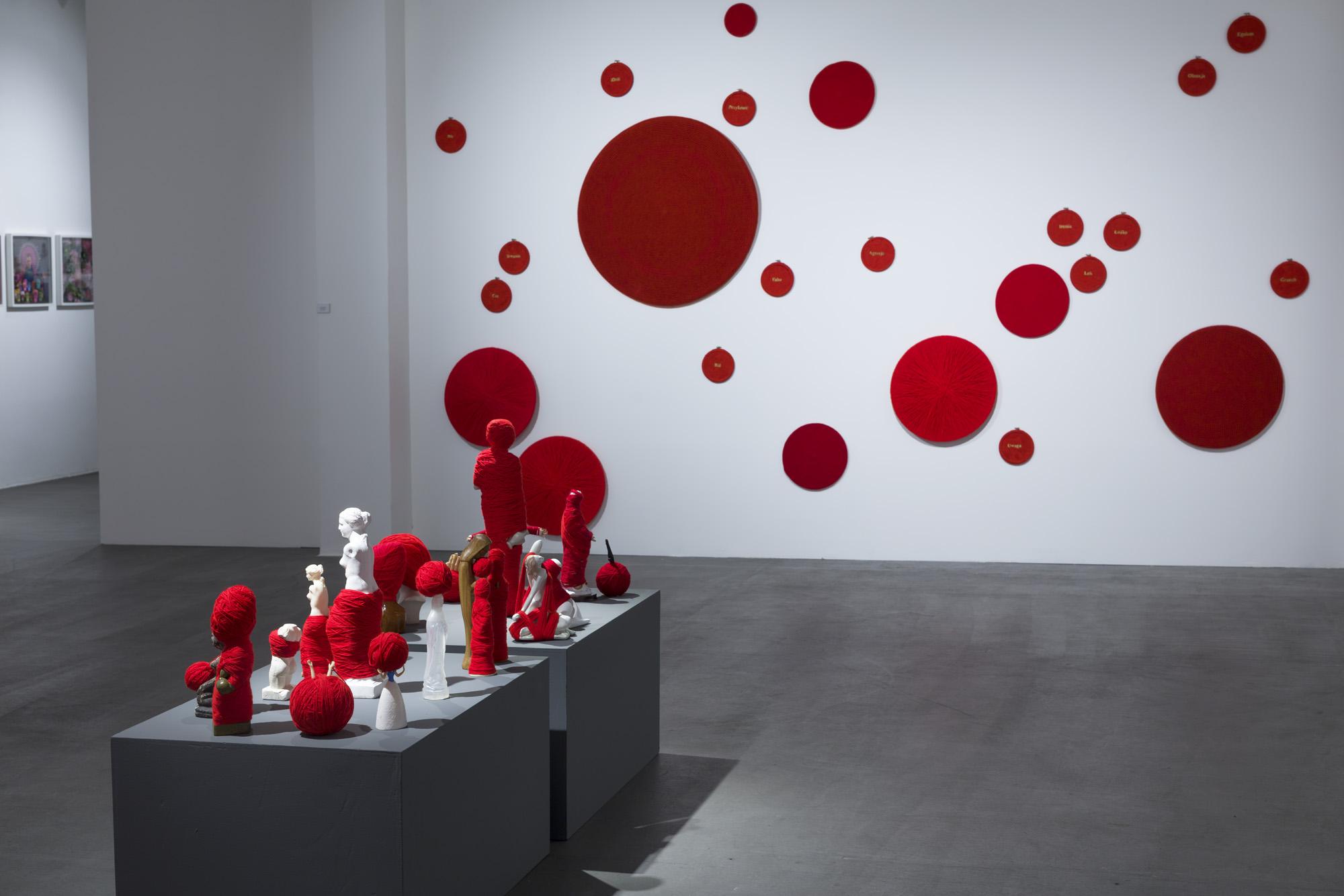 Ekspozycję tworzą tekstylne i fotograficzne kolaże, obiekty przestrzenne, fotografie, obrazy z włóczki oraz hafty. Formalnym i symbolicznym leitmotivem tej prezentacji są nici krawieckie i włóczka. Ania naszywa wizerunki kobiece i zwierzęce, przedmioty i motywy roślinne na obrusy, chusty i inne wzorzyste materiały. Ja zszywam ze sobą fotografie zwierząt, kwiatów i fragmentów ciała ludzkiego. Ania oplata czerwoną włóczką gipsowe, drewniane i plastikowe figurki kobiece. Ja fotografuję żywe ciało obandażowane czerwoną włóczką. Z włóczkowych kłębków Ani wynurzają się nogi i ręce lalek. Na moich fotografiach prawdziwe ręce i nogi obejmują wielkie kokony.