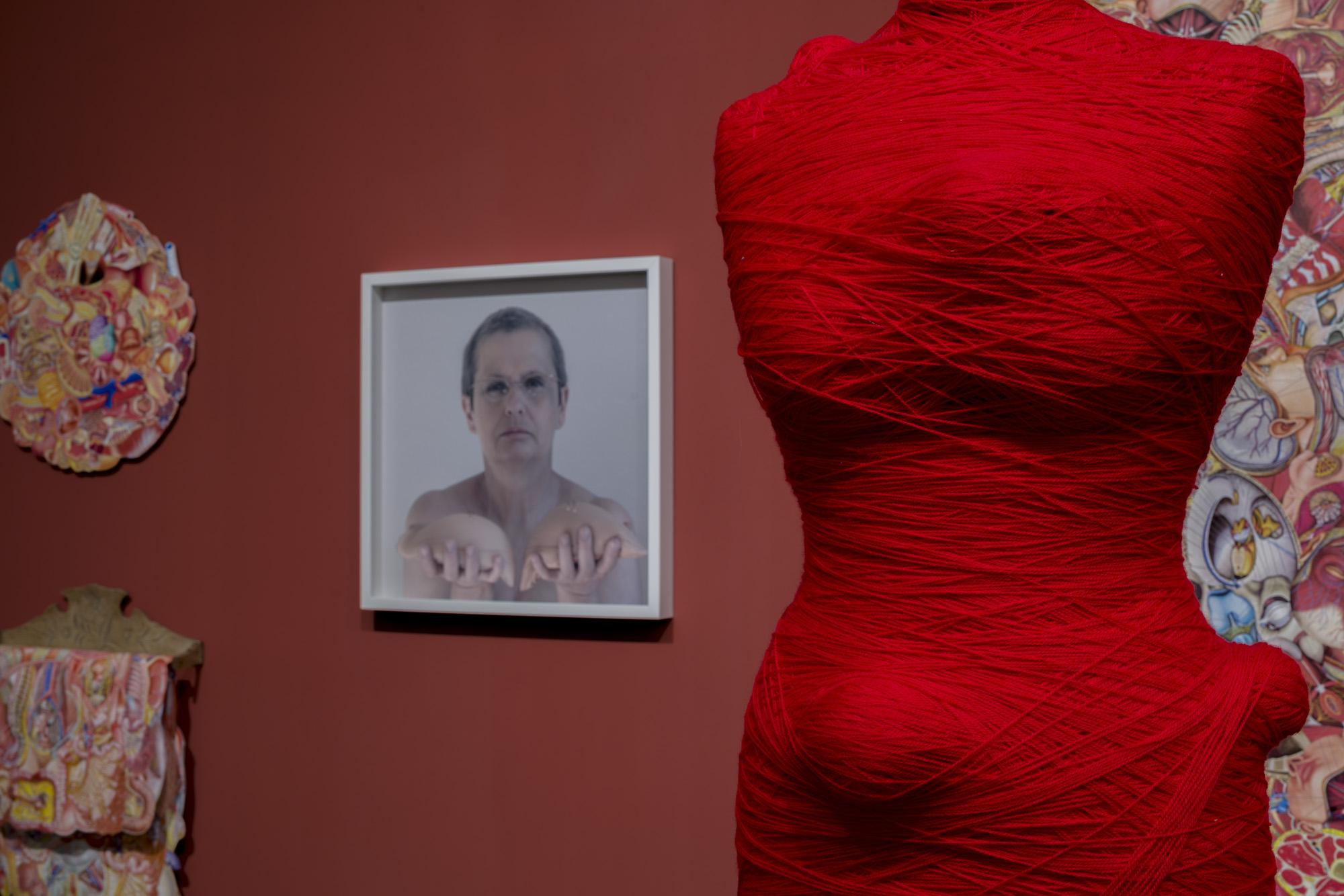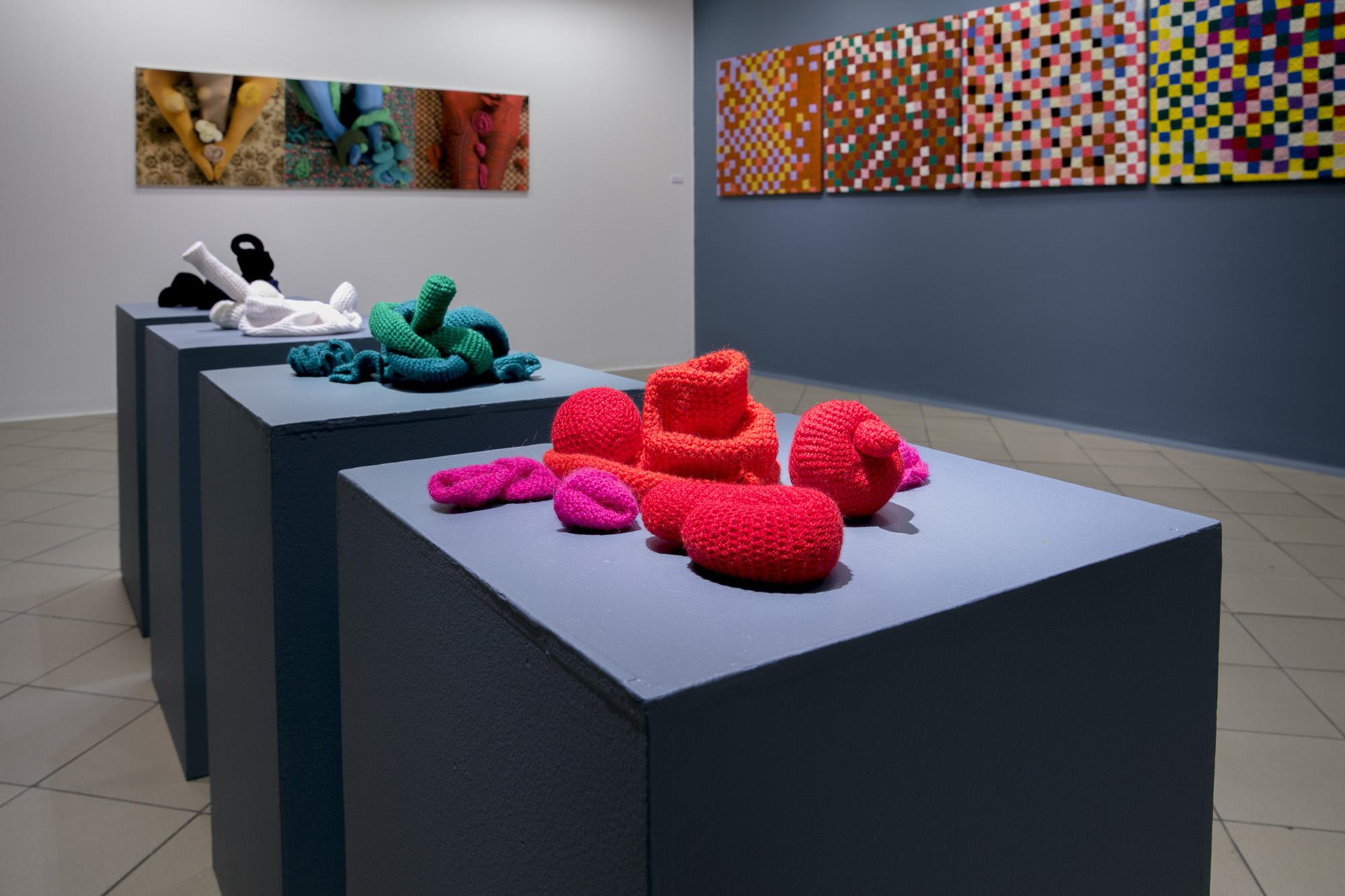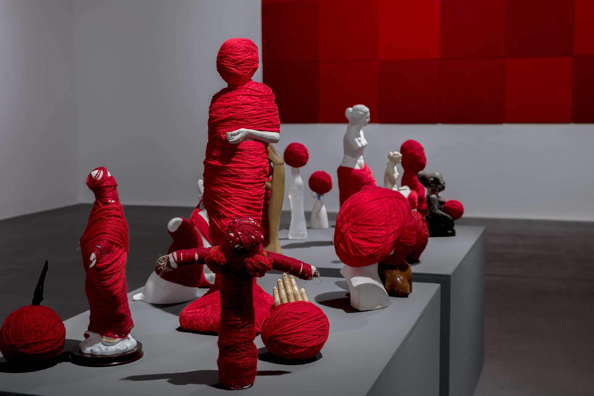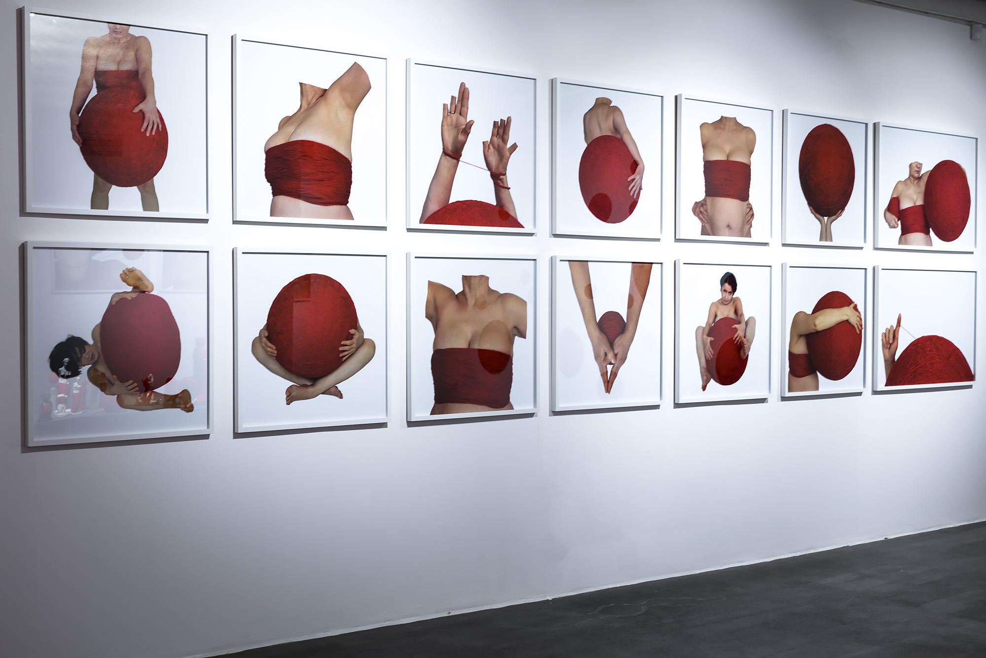 Ekspozycję tworzą tekstylne i fotograficzne kolaże, obiekty przestrzenne, fotografie, obrazy z włóczki oraz hafty. Formalnym i symbolicznym leitmotivem tej prezentacji są nici krawieckie i włóczka. Ania naszywa wizerunki kobiece i zwierzęce, przedmioty i motywy roślinne na obrusy, chusty i inne wzorzyste materiały. Ja zszywam ze sobą fotografie zwierząt, kwiatów i fragmentów ciała ludzkiego. Ania oplata czerwoną włóczką gipsowe, drewniane i plastikowe figurki kobiece. Ja fotografuję żywe ciało obandażowane czerwoną włóczką. Z włóczkowych kłębków Ani wynurzają się nogi i ręce lalek. Na moich fotografiach prawdziwe ręce i nogi obejmują wielkie kokony.