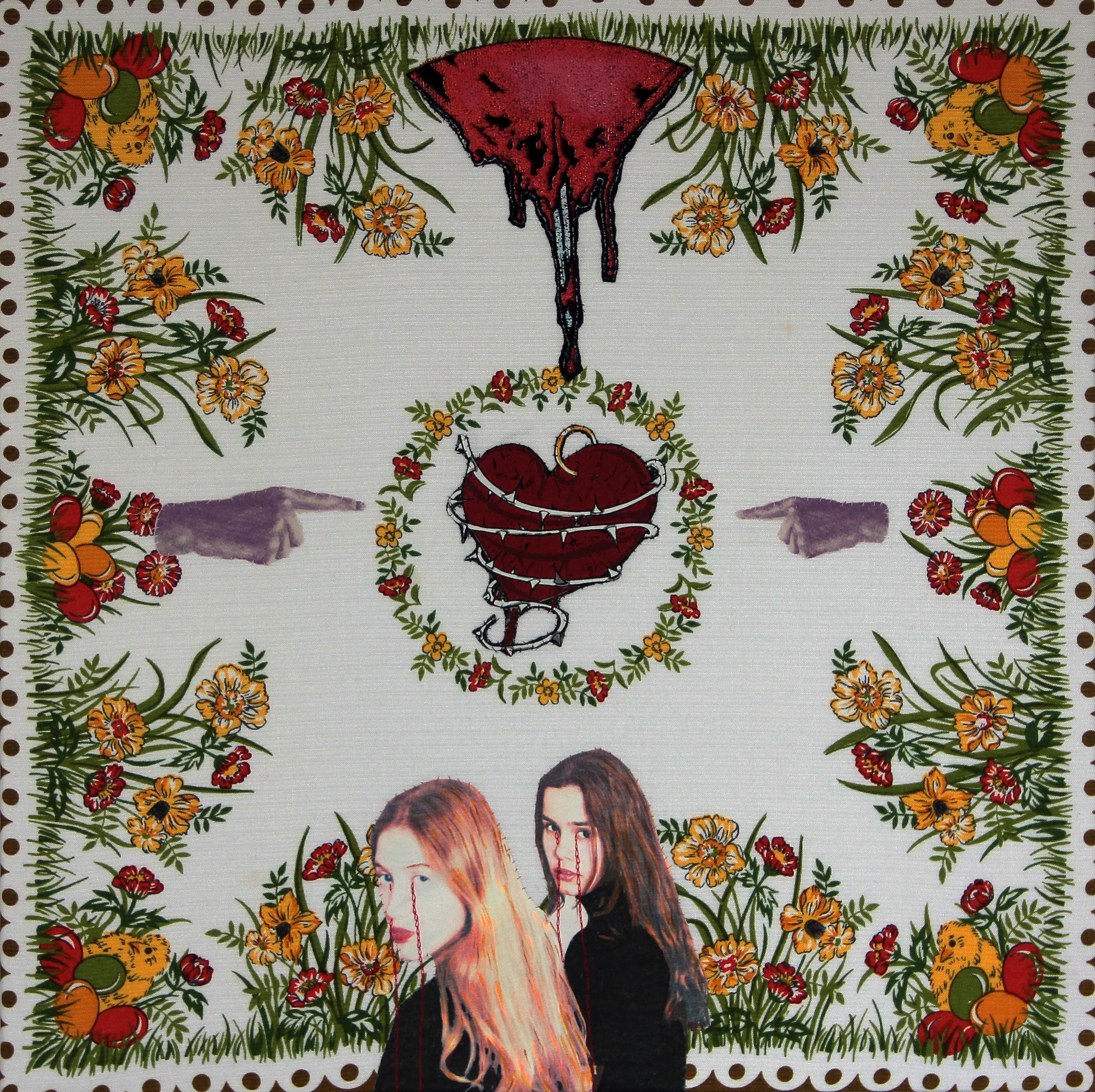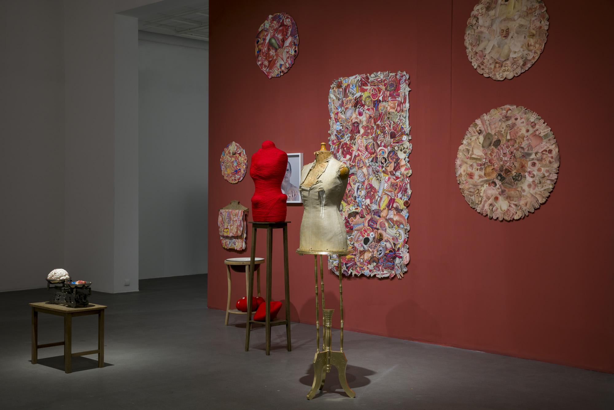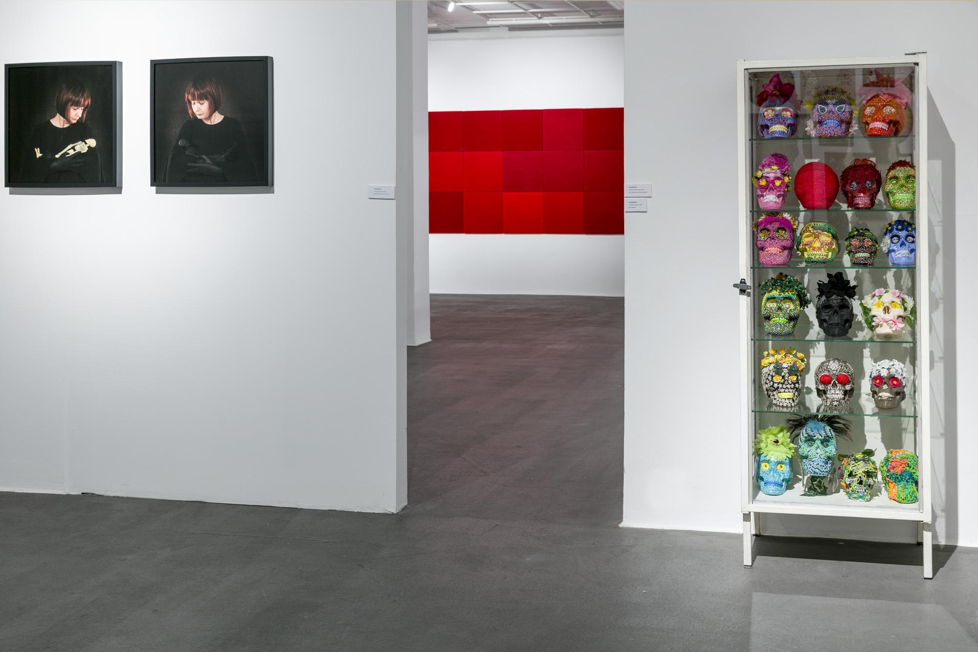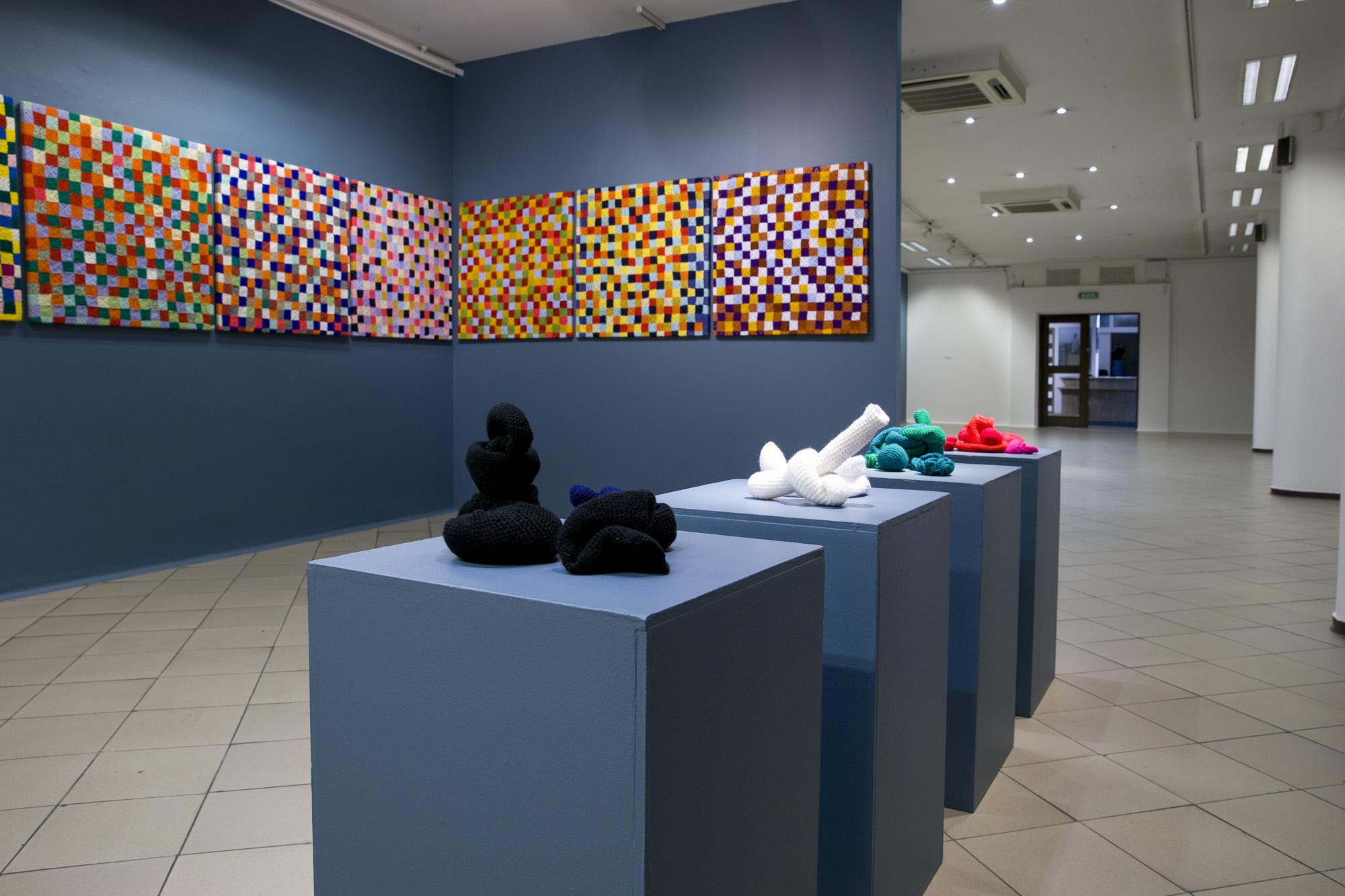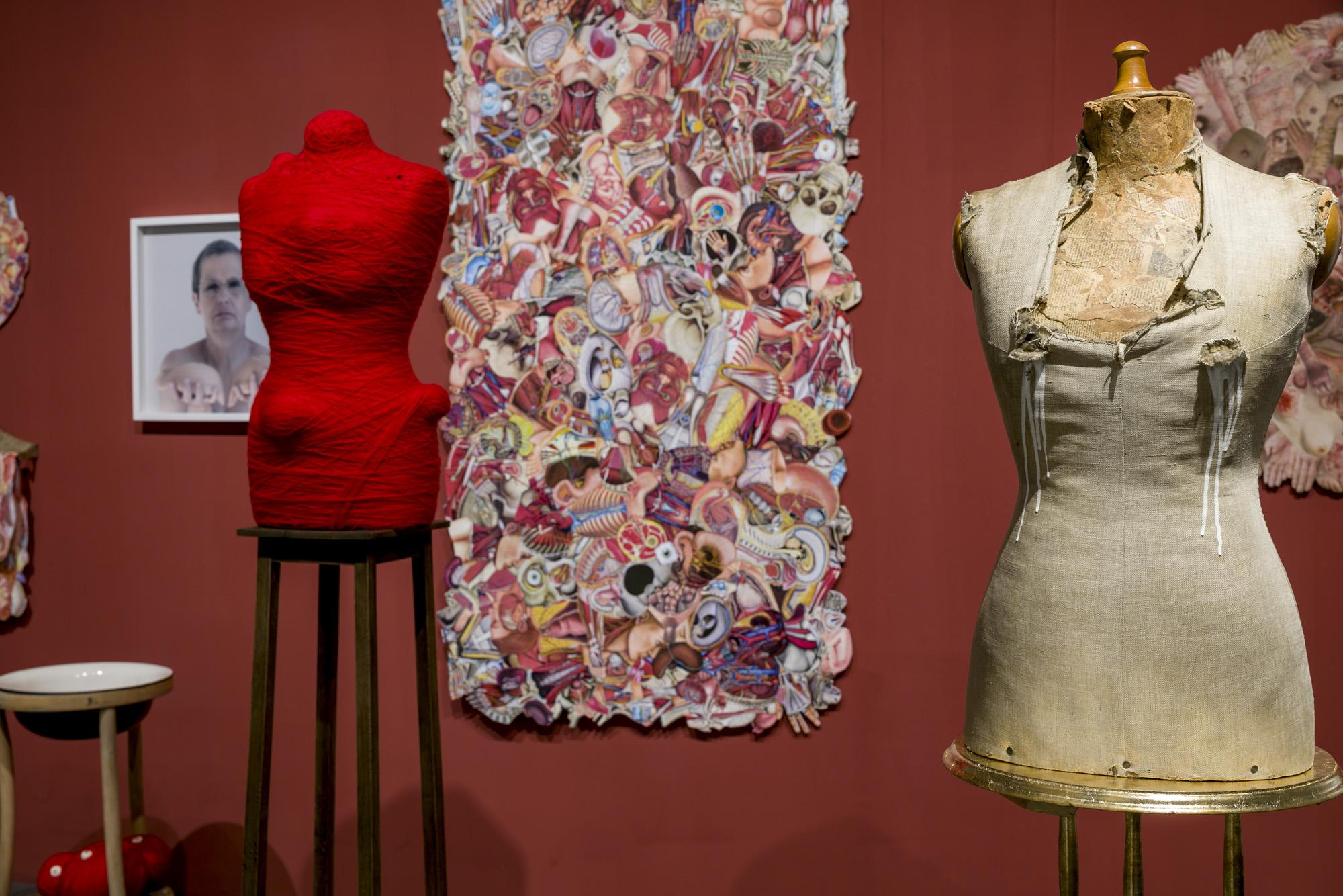 Ekspozycję tworzą tekstylne i fotograficzne kolaże, obiekty przestrzenne, fotografie, obrazy z włóczki oraz hafty. Formalnym i symbolicznym leitmotivem tej prezentacji są nici krawieckie i włóczka. Ania naszywa wizerunki kobiece i zwierzęce, przedmioty i motywy roślinne na obrusy, chusty i inne wzorzyste materiały. Ja zszywam ze sobą fotografie zwierząt, kwiatów i fragmentów ciała ludzkiego. Ania oplata czerwoną włóczką gipsowe, drewniane i plastikowe figurki kobiece. Ja fotografuję żywe ciało obandażowane czerwoną włóczką. Z włóczkowych kłębków Ani wynurzają się nogi i ręce lalek. Na moich fotografiach prawdziwe ręce i nogi obejmują wielkie kokony.