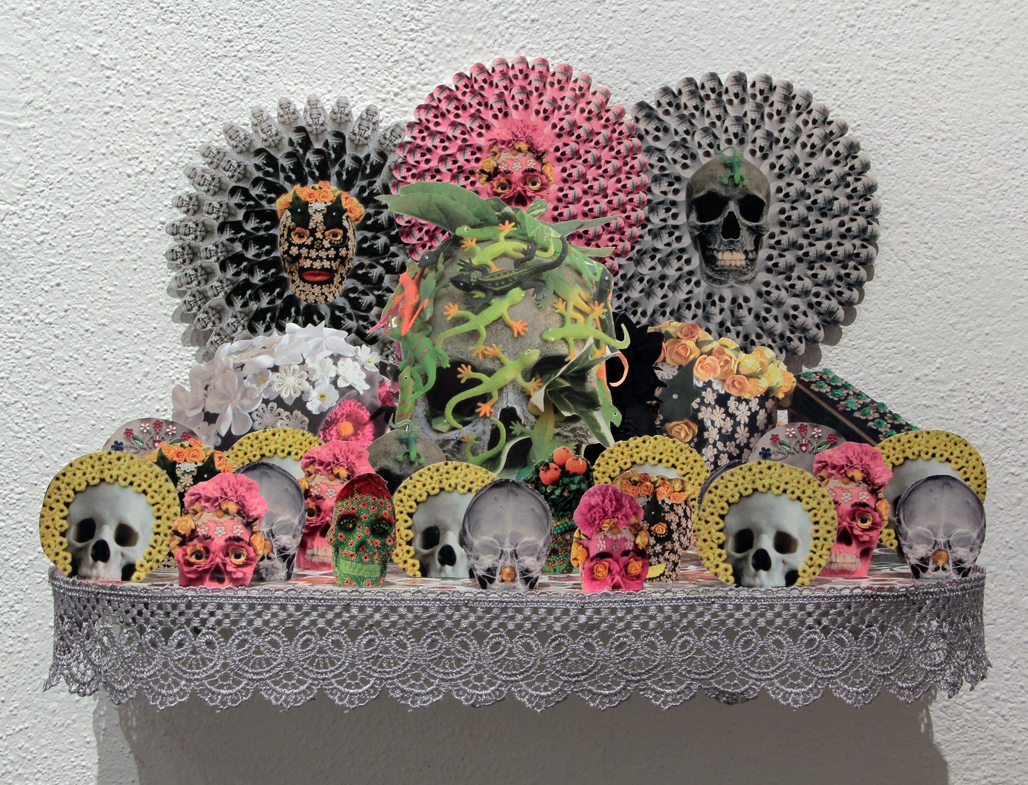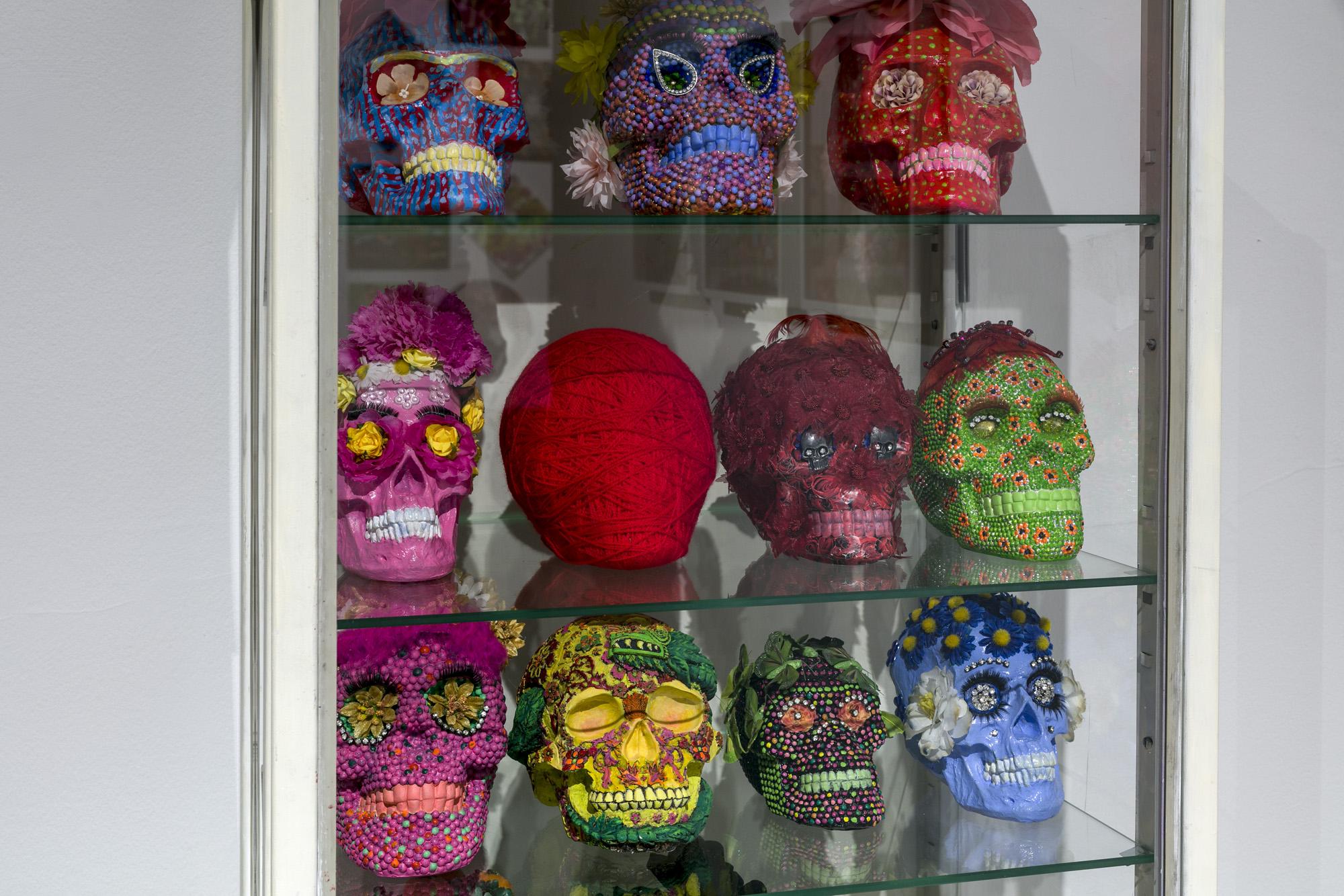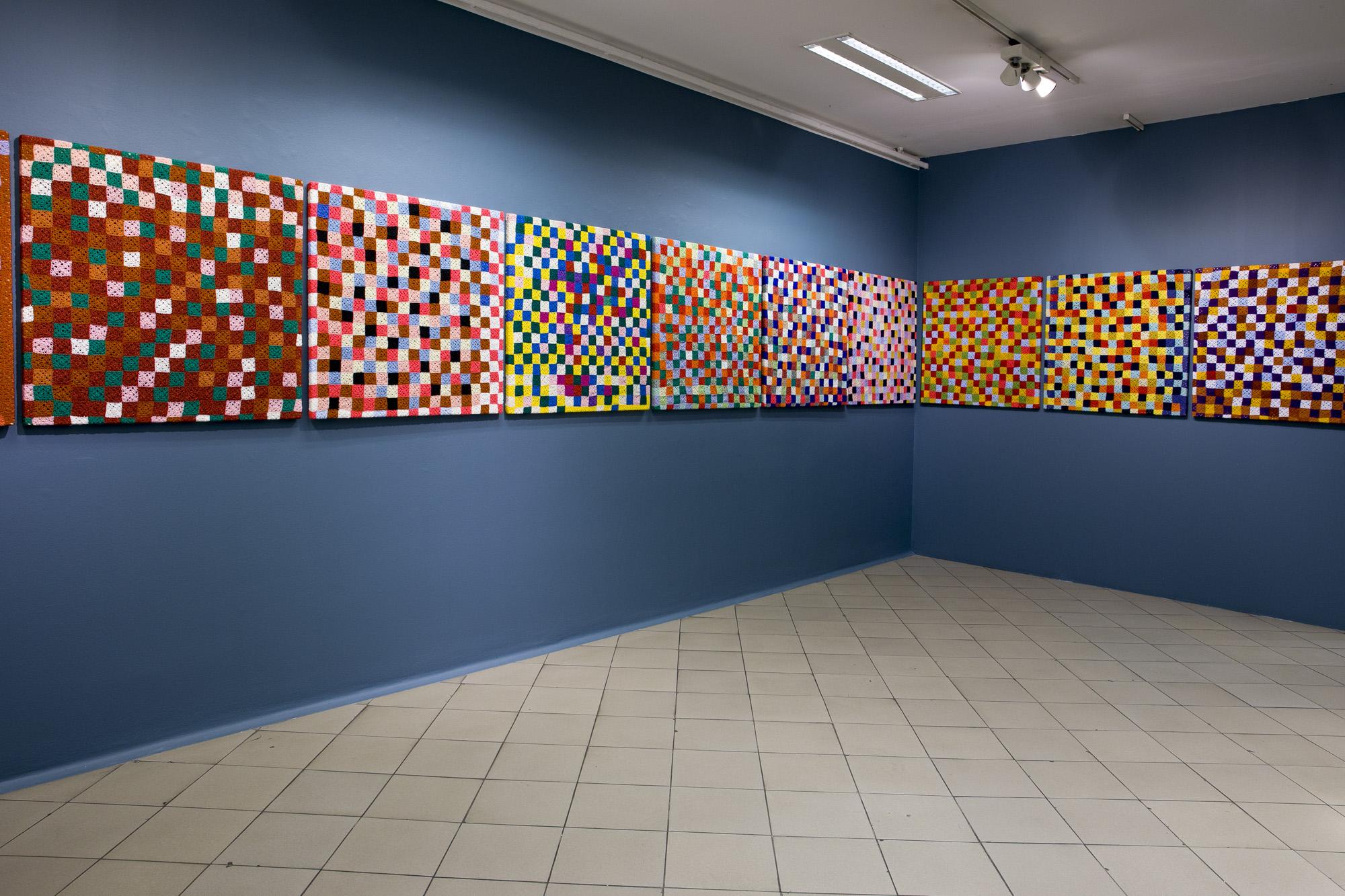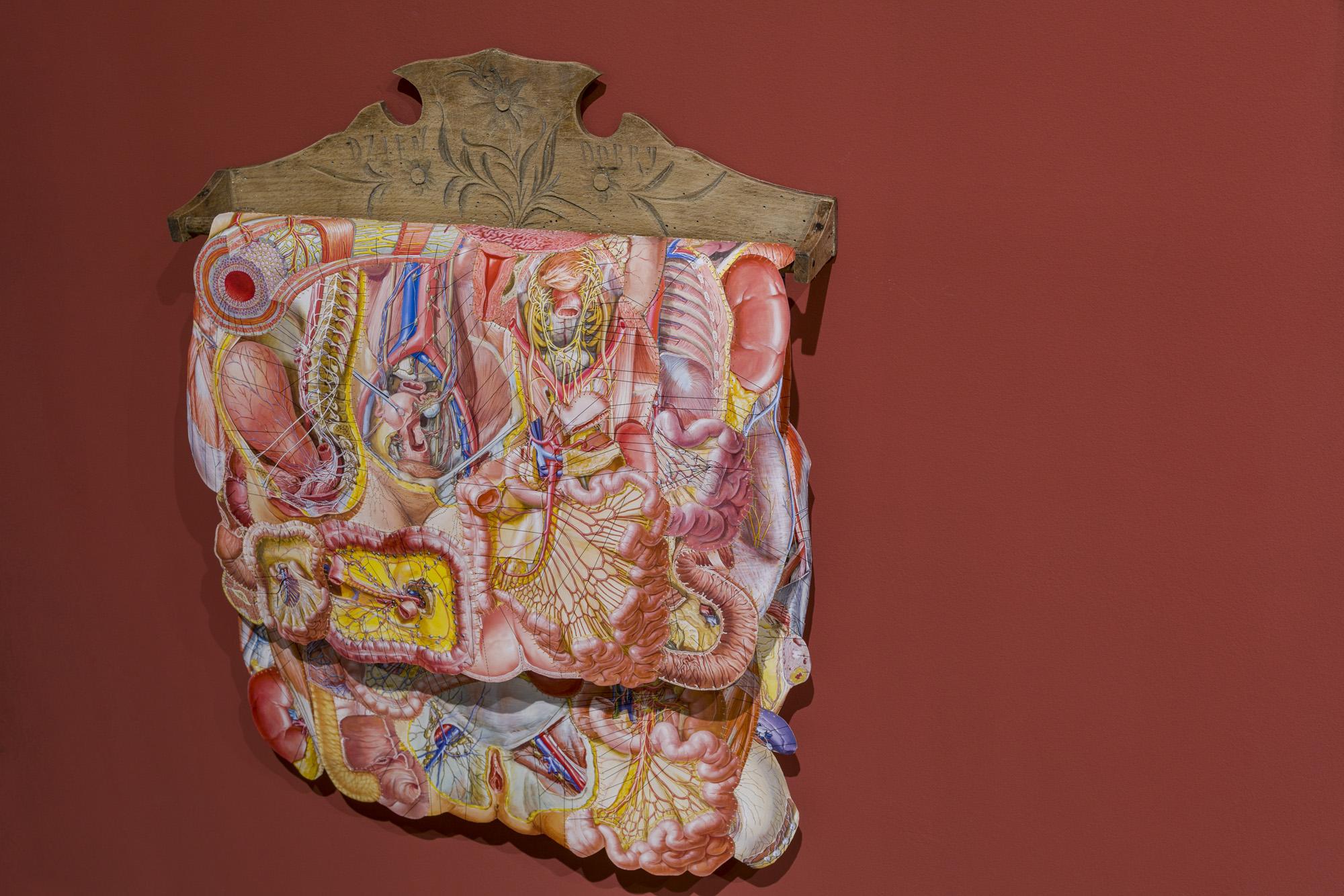 Ekspozycję tworzą tekstylne i fotograficzne kolaże, obiekty przestrzenne, fotografie, obrazy z włóczki oraz hafty. Formalnym i symbolicznym leitmotivem tej prezentacji są nici krawieckie i włóczka. Ania naszywa wizerunki kobiece i zwierzęce, przedmioty i motywy roślinne na obrusy, chusty i inne wzorzyste materiały. Ja zszywam ze sobą fotografie zwierząt, kwiatów i fragmentów ciała ludzkiego. Ania oplata czerwoną włóczką gipsowe, drewniane i plastikowe figurki kobiece. Ja fotografuję żywe ciało obandażowane czerwoną włóczką. Z włóczkowych kłębków Ani wynurzają się nogi i ręce lalek. Na moich fotografiach prawdziwe ręce i nogi obejmują wielkie kokony.
