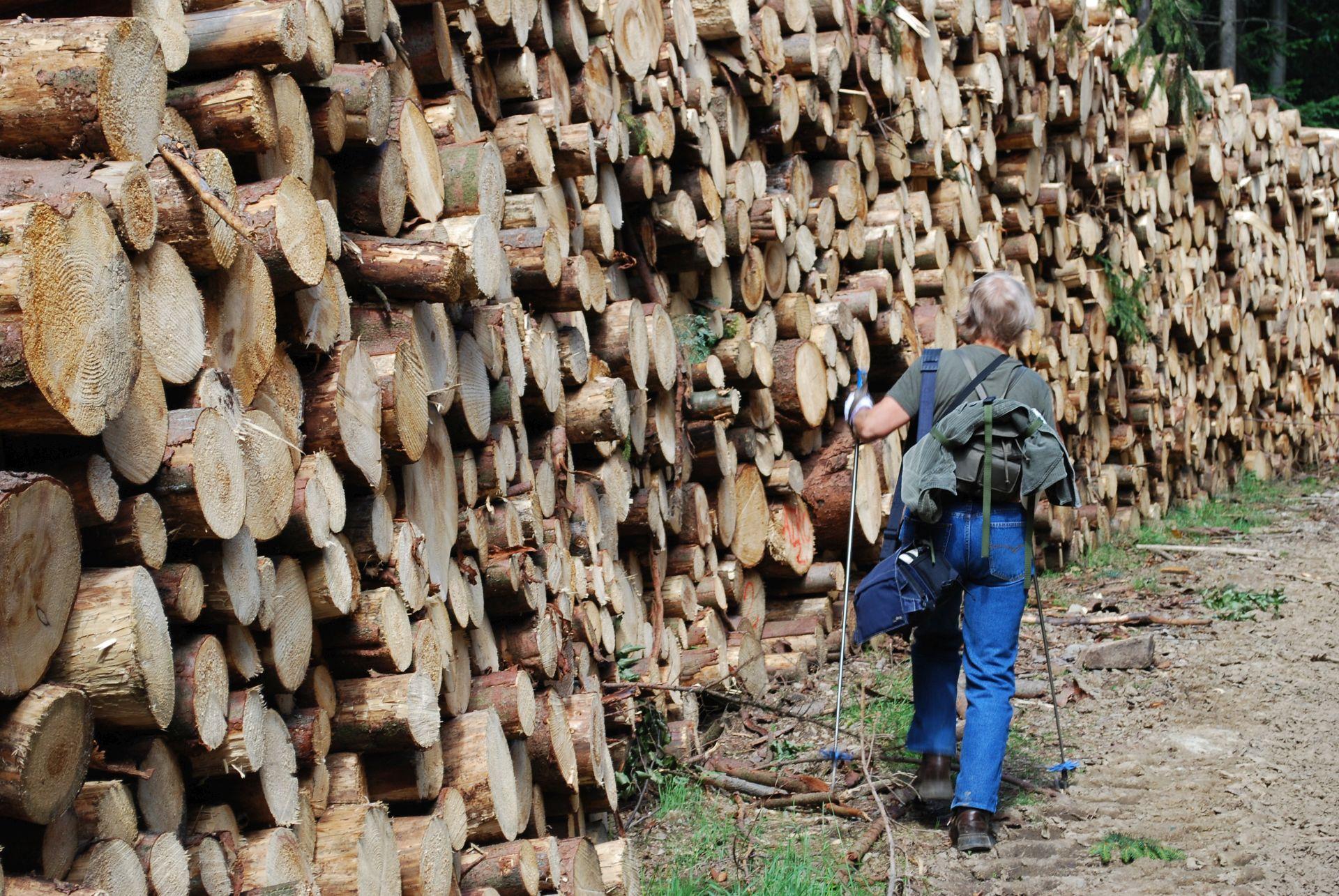 Pnie usuwanych drzew układane na polankach i wzdłuż ścieżek w monumentalne stosy skojarzyły mi się z piramidami. Okorowane – mienią się w słońcu srebrem i złotem, a ścięte piłą przekroje ukazują interesujące wzory i faktury włókien, słoi i sęków.