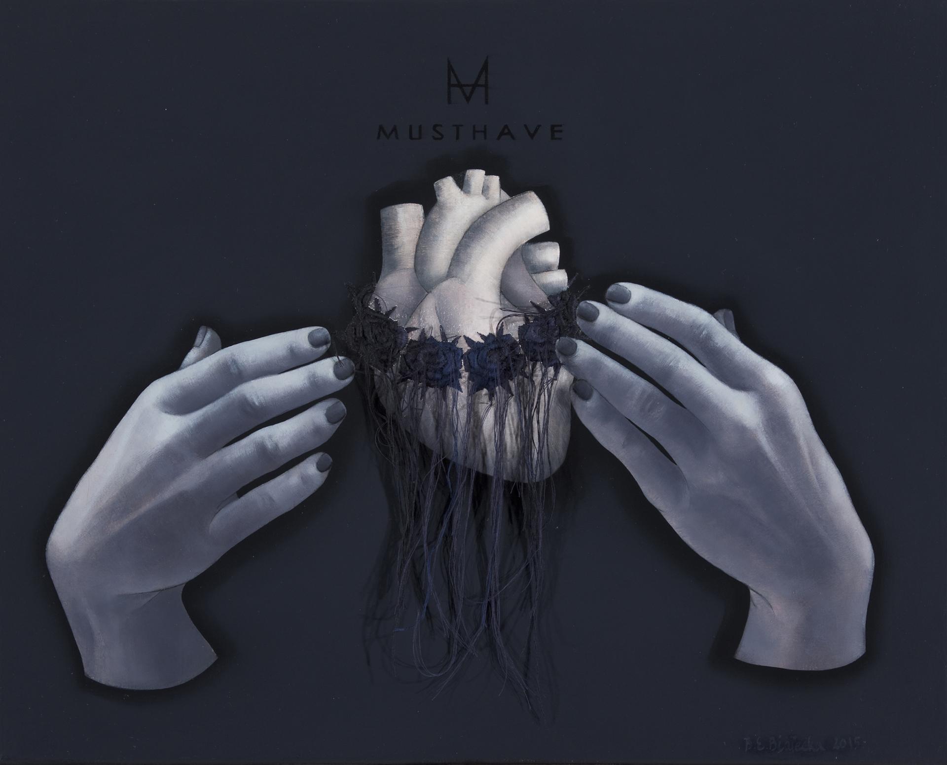 Rozszerzyłam tradycyjne malarstwo o element rzemiosła. Krosno malarskie stało się jednocześnie krosnem hafciarskim. Praca ta polega na dosłownym przekłuciu obrazu igłą, czyli de facto na destrukcji powierzchni malatury. Haft jest powtarzalną, medytacyjną czynnością, kojącą i ból, i nerwy. Haftowane płuca, serca, ręce, stopy przyjmują formę współczesnego relikwiarza. Slogan „Must Have” włącza się do gry znaczeń. Ręce i stopy haftowane są w miejscach stygmatów. To rodzaj zaklinania życia, ale i głębokiego przeświadczenia o tym, że do jego pełni niezbędne jest cierpienie, które prędzej czy później doświadcza każdego bez wyjątku. Są znakiem bólu i udziału w cierpieniu niezbędnym – w tradycji religijnej – do odkupienia.