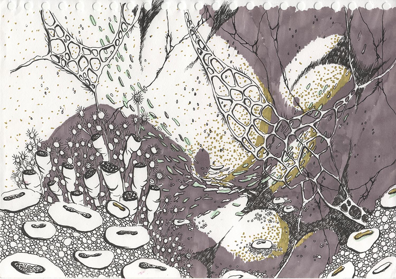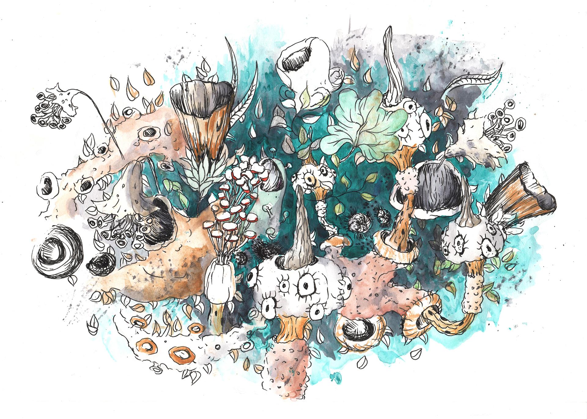 Ewa Goral od ponad 10 lat, po podróży po Indiach, olśniona bogactwem azjatyckiej przyrody, w swojej twórczości rozwija wątki związane z naturą. Nie są to klasyczne rysunki botaniczne, a formy organiczne. Tworzą nieantropocentryczne historie, będące efektem wewnętrznego przeżywania natury. Podpatrzone w przyrodzie, przefiltrowane przez wyobraźnię, stają się niejednoznacznymi hybrydami pełnymi znaczeń i symboli.