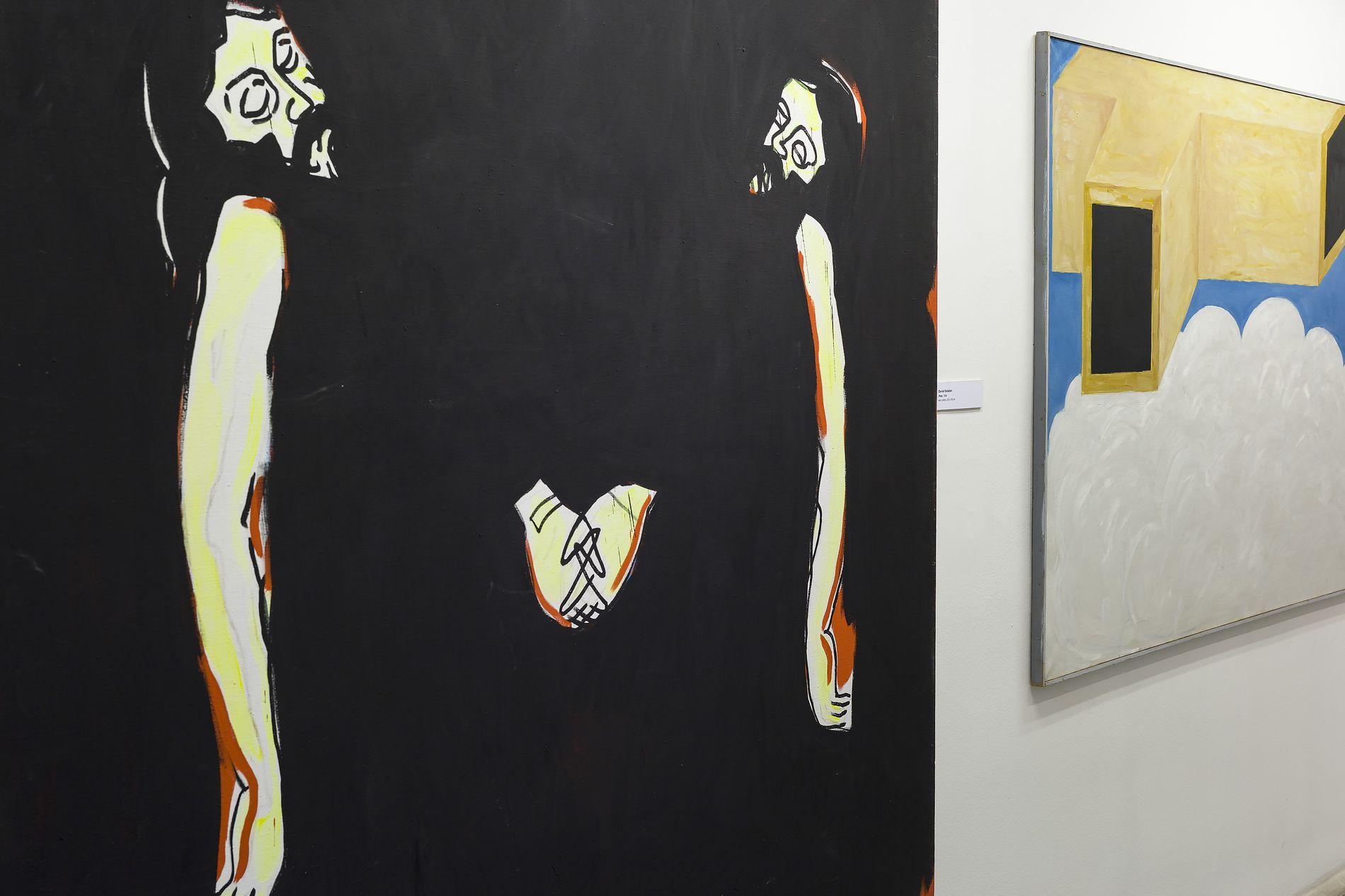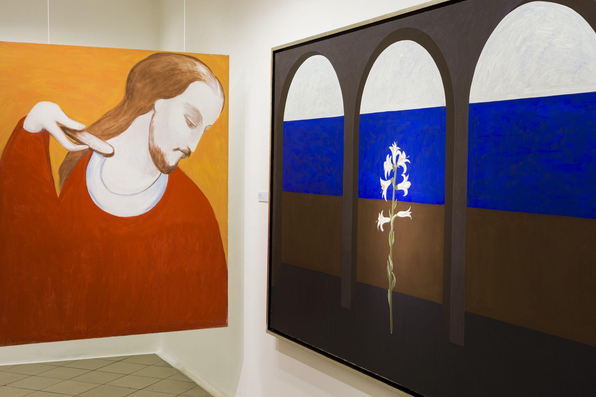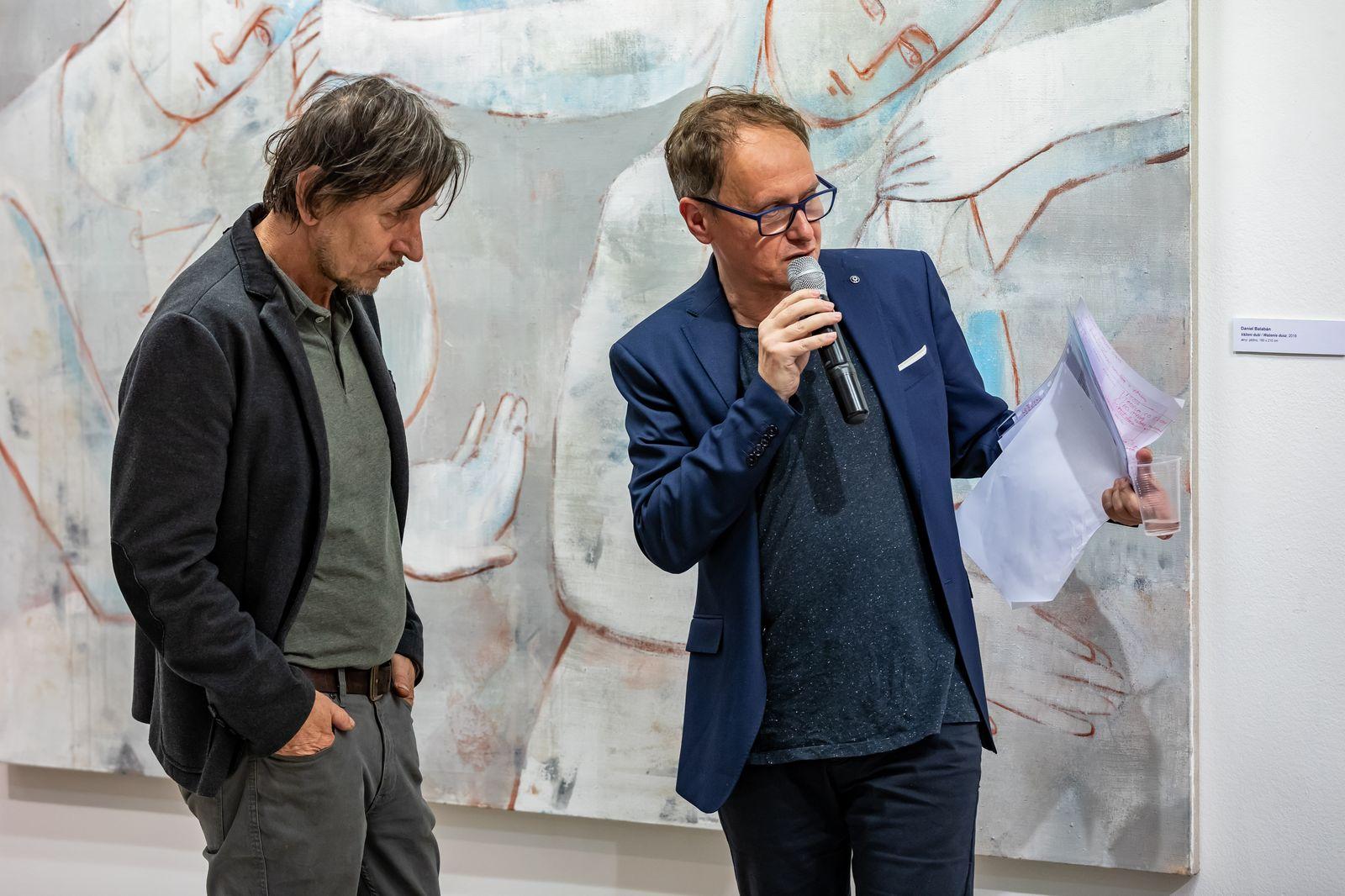 Wystawa jest spotkaniem dwóch niezwykłych artystów i dwóch odmiennych stylistyk malarskich. Mimo różnic w warstwie materialnej, łączy je silny akcent stawiany na warstwę duchową obrazu. Analityczna postawa wychowanego w kulturze protestanckiej Daniela Balabána, interpretującego średniowieczne portrety mistrza Teodoryka postmodernistycznymi zabiegami malarskimi, spotyka się z oszczędnymi w formie obrazami Jarosława Modzelewskiego, silnie działającymi płaszczyzną koloru i syntetycznie przedstawianą postacią człowieka. Obecność symboli religijnych w pracach obu malarzy, staje się pretekstem do dyskusji na temat wartości moralnych i roli artysty w materializowaniu piękna – także w sferze duchowej. Dzięki intuicji i wrażliwości oraz wypracowanej technice malarskiej obaj umiejętnie stawiają pytania o sens ludzkiej egzystencji. Buntowniczy temperament Balabána kontrastuje z kontemplacyjną postawą Modzelewskiego. Pojawiające się w ich obrazach akcenty humoru i ironii uwalniają autorów od patosu i moralizowania. Duże formaty prezentowanych prac pozwalają widzowi dosłownie zanurzyć się w malarstwie.