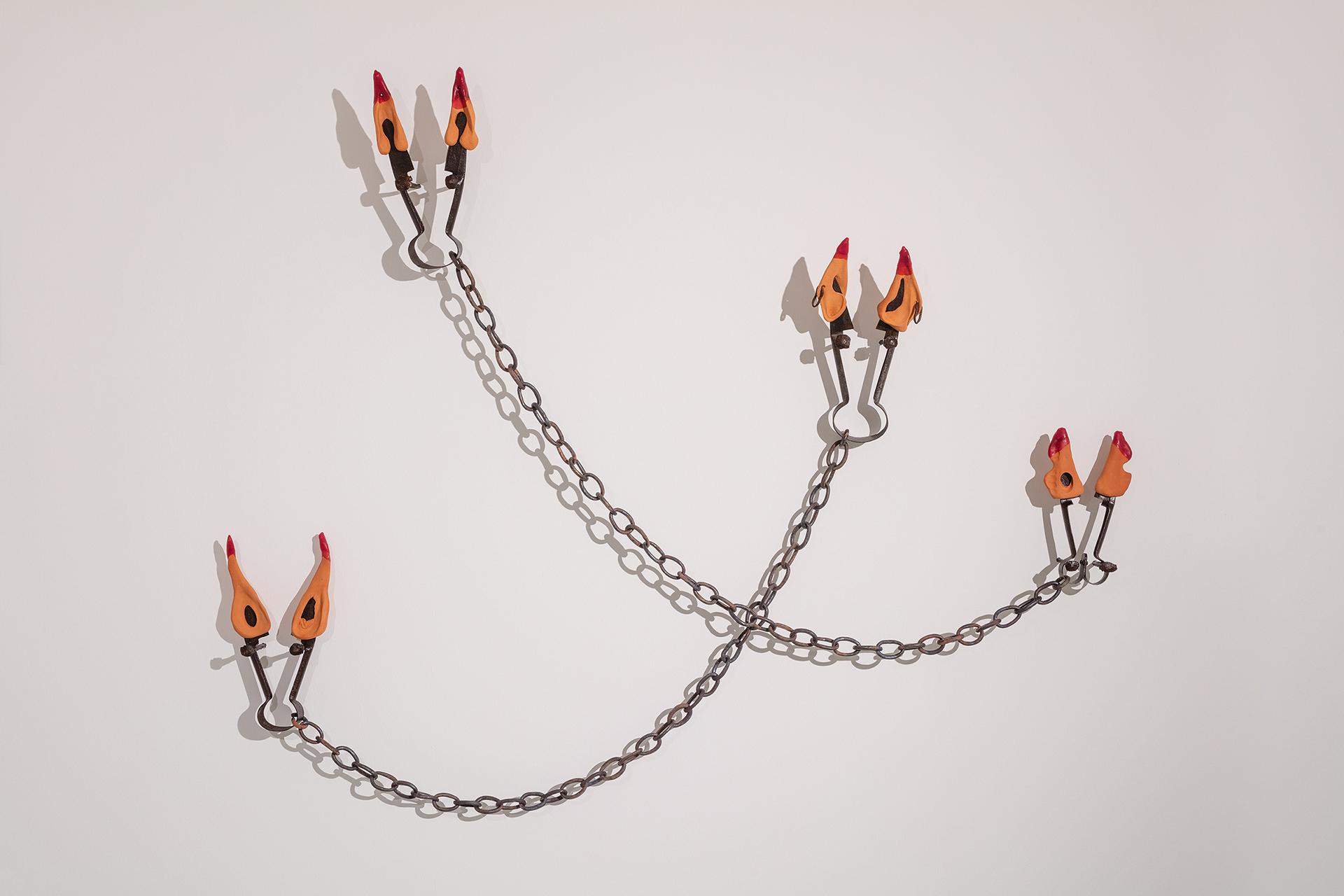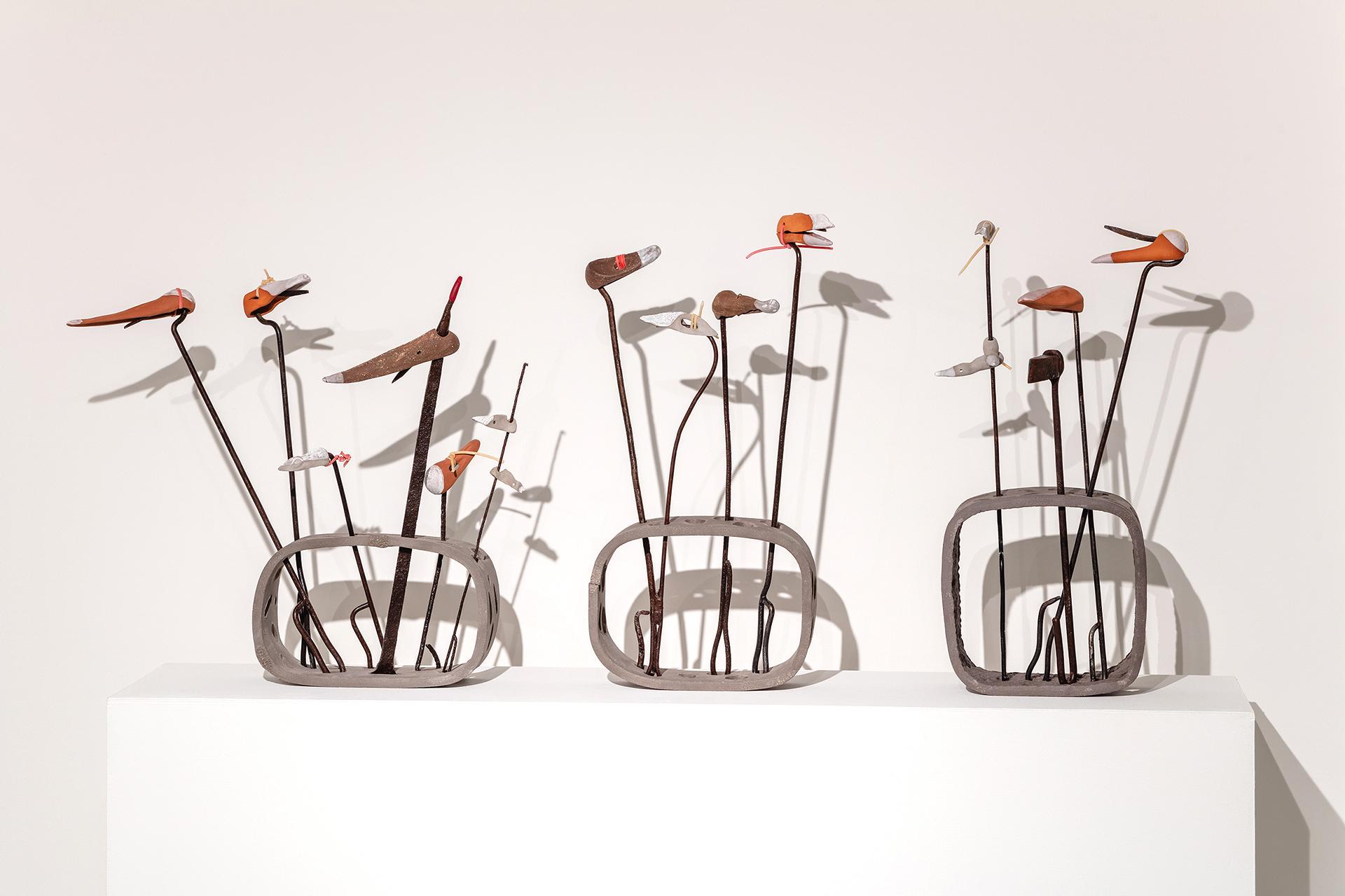 Wystawa prac Patrycji Orzechowskiej jest zbiorem zagadkowych przedmiotów, zawierających tymczasowe sojusze. Zanurzając się w jej sensorium, łatwo da się rozpoznać niektóre jej części: hak, rdza, miękkie, twarde, ziemia, glina, szpikulec, gwóźdź, klatka, fałda, naczynie, różnica: pełne/puste. Rozpoznawanie opiera się na różnicy. Od tego zaczynamy. Używając wzroku, niektóre układy kresek rozpoznajemy jako rysy ludzkiej twarzy (to ewolucyjne przystosowanie), dwa wydłużone trójkąty, to nożyce. Co jednak dzieje się, kiedy zaciera się wyrachowana czytelność funkcji nadanej przedmiotom przez ich twórców, gdy te tracą swój gospodarczy i ekonomiczny sens? Inteligencja, ludzka czy sztuczna, łaknie odniesień, porównań, podobieństw. Ignoruje to, co niejasne i z jej perspektywy bezsensowne. Na tym napięciu pracują obiekty Orzechowskiej. Zahaczają się o skojarzenia i trzymają tak długo, jak się da. Przyciągają i za moment odpychają. Wycofują się z pierwszych emocji, wciągają spojrzenie w dziwne, paradoksalne interpretacje, które rozmijają się z datowaniem gromadzonych przez artystkę przedmiotów. Tworzą nowe kombinacje, żadne z nich jednak nie są trwałe ani ostateczne.