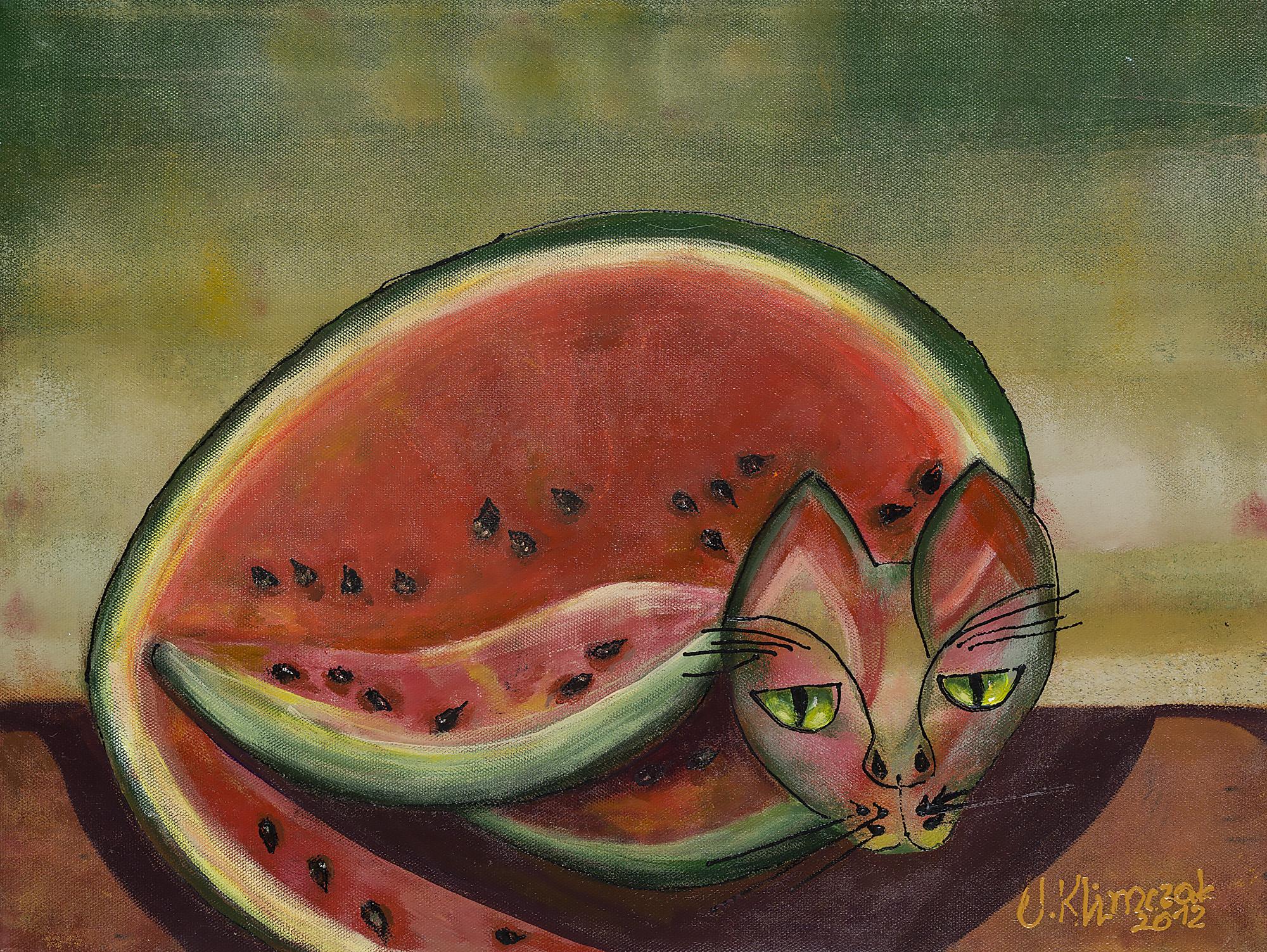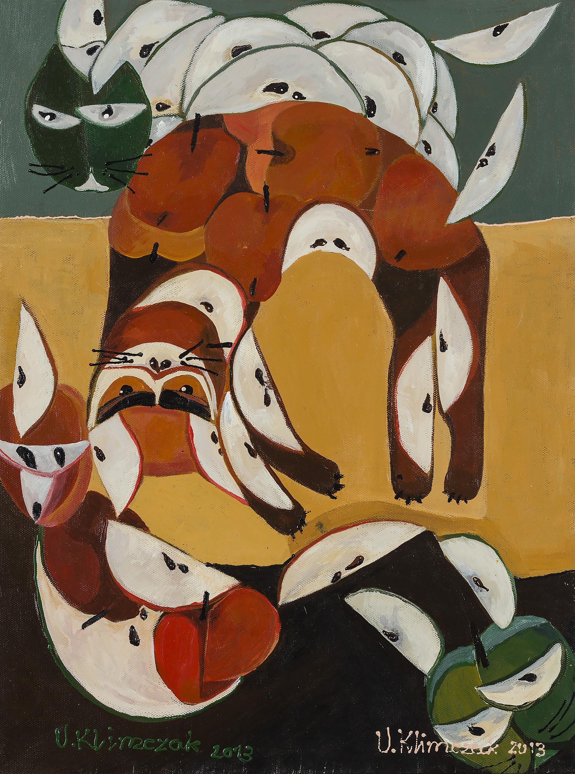 Seria „owocowych” kotów, pomysł realizowany od 2012 roku, łączy z pewną dozą humoru portret kota z martwą naturą. Inspirowane twórczością manierystycznego malarza Arcimboldiego, koty Urszuli Klimczak są niemal katalogiem różnorodnych owoców, malowanych płasko, dekoracyjnie. W ostatnich pracach („Kot w papajach”, 2017) jej styl się zmienia, pojawia się światłocień i subtelna kolorystyka, bliższa malarstwu holenderskiemu.