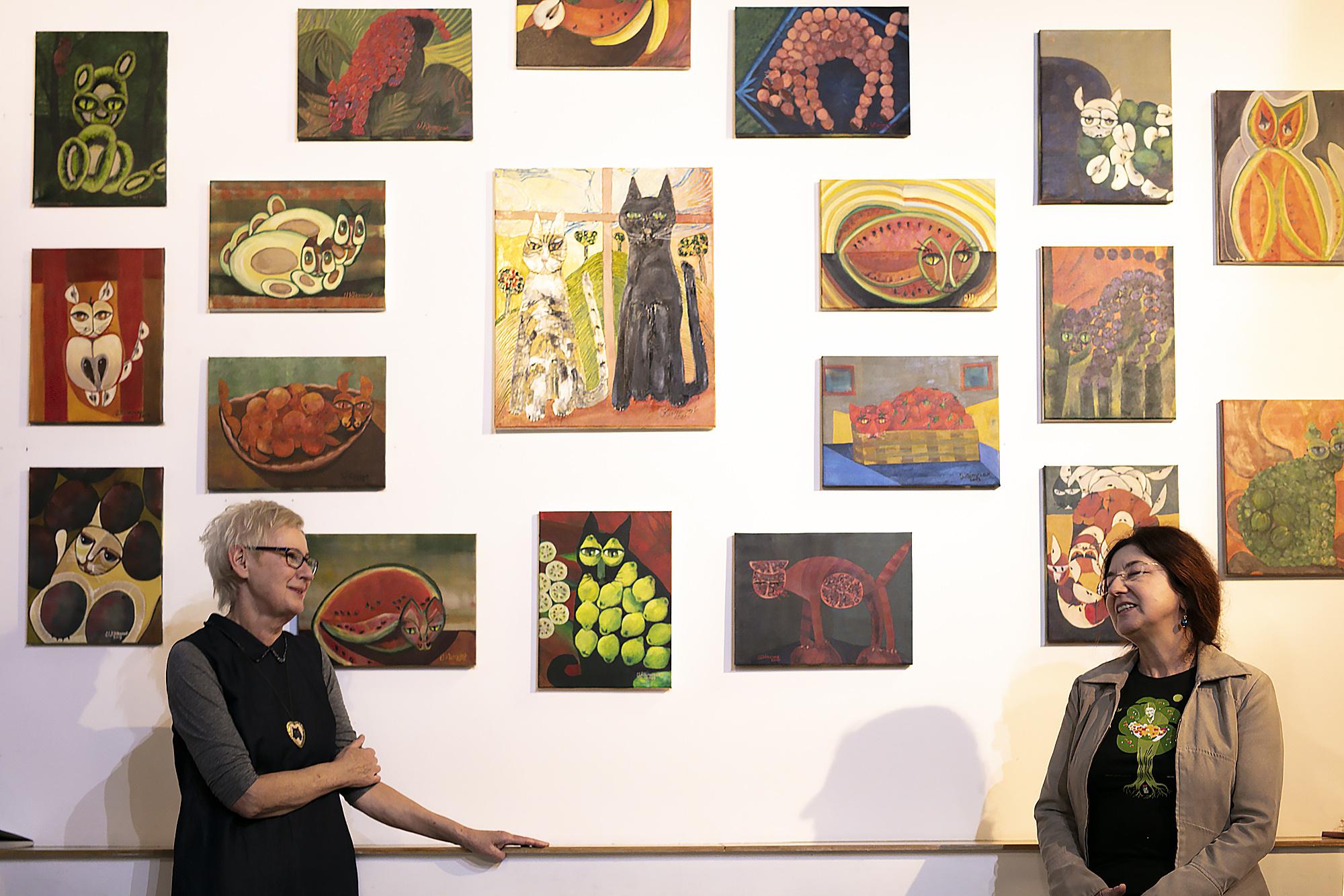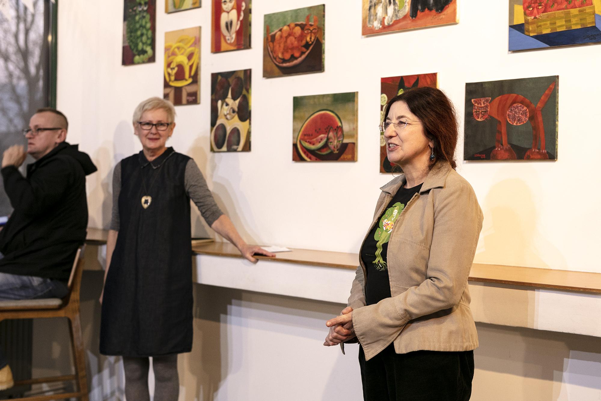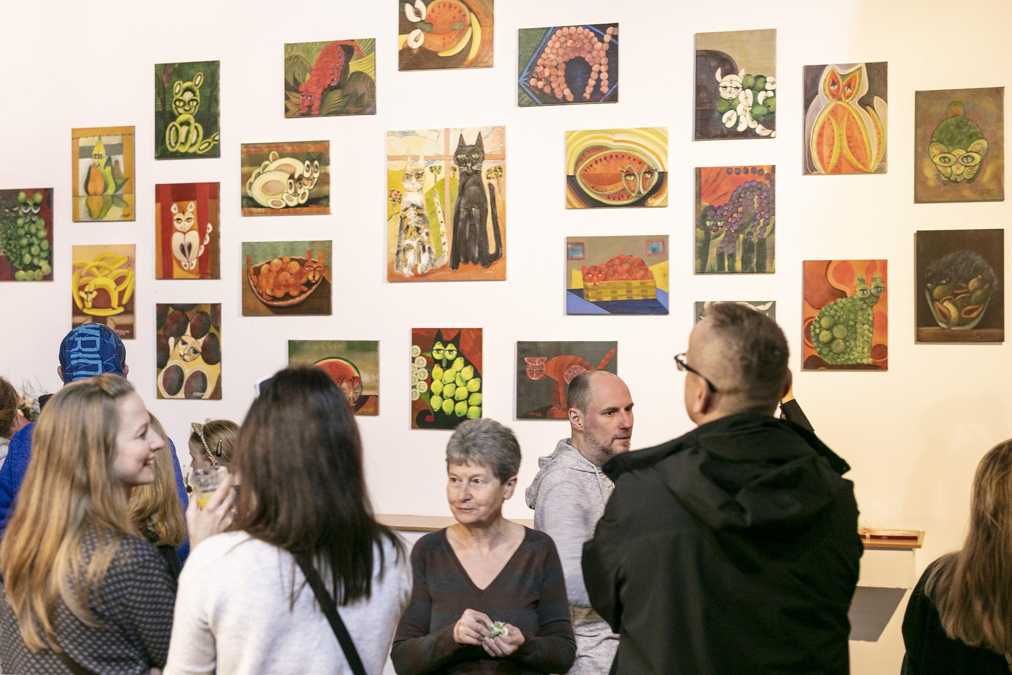 Humorystyczne przedstawienia kotów w owocowych odsłonach na obrazach oraz w fotorelacji z wernisażu wystawy.