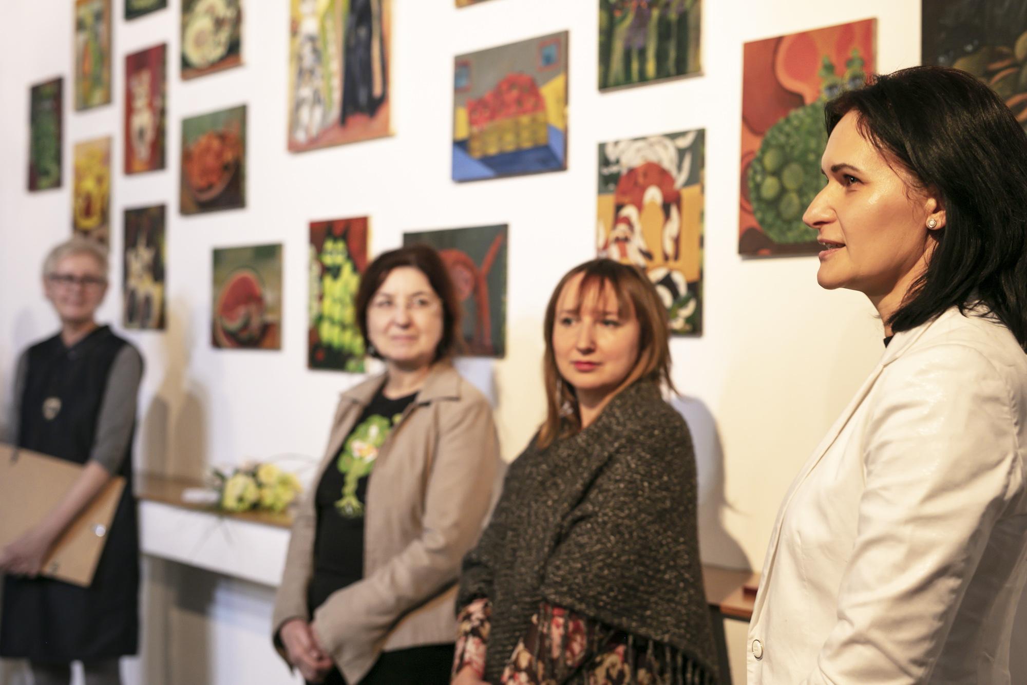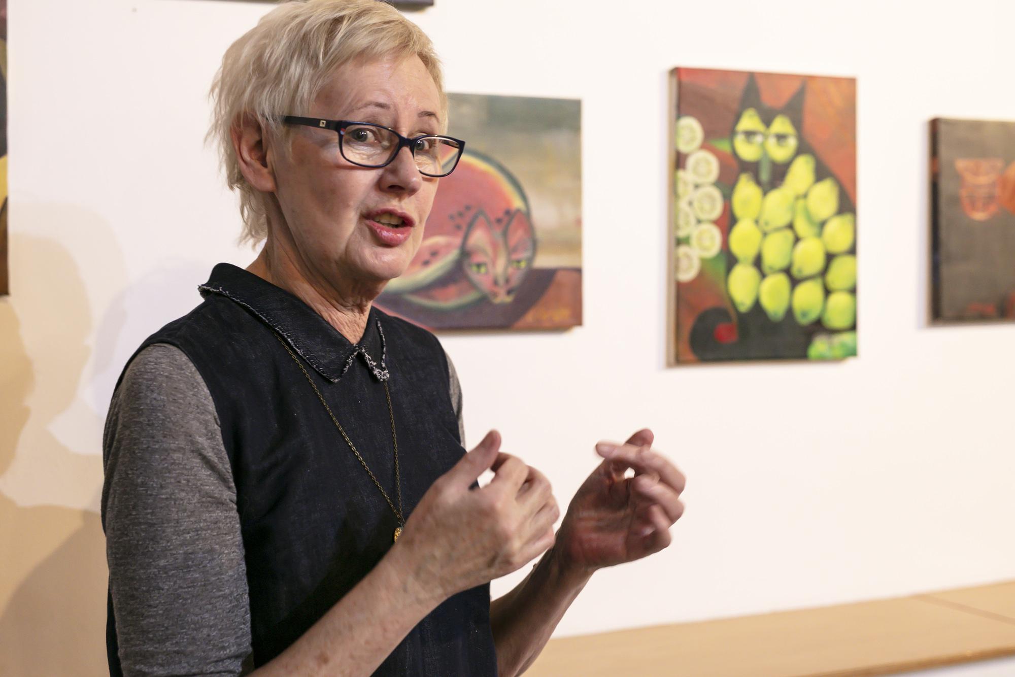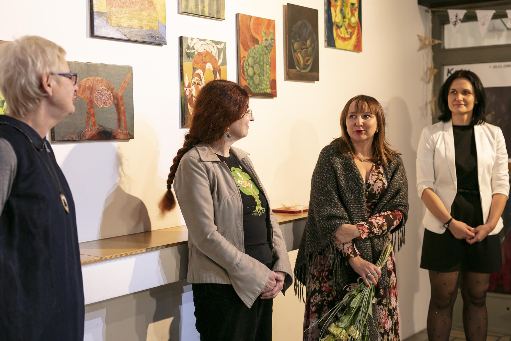 Humorystyczne przedstawienia kotów w owocowych odsłonach na obrazach oraz w fotorelacji z wernisażu wystawy.