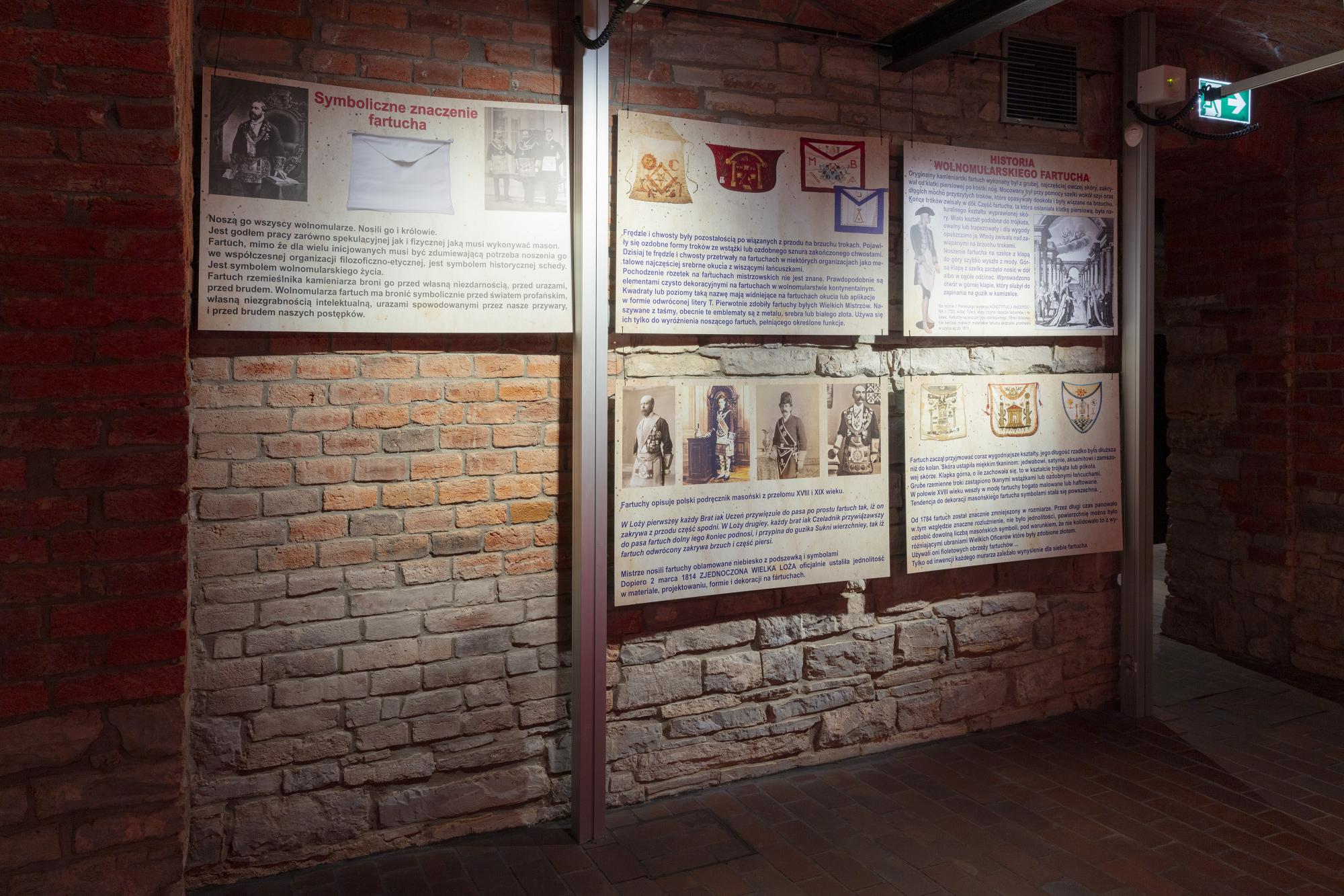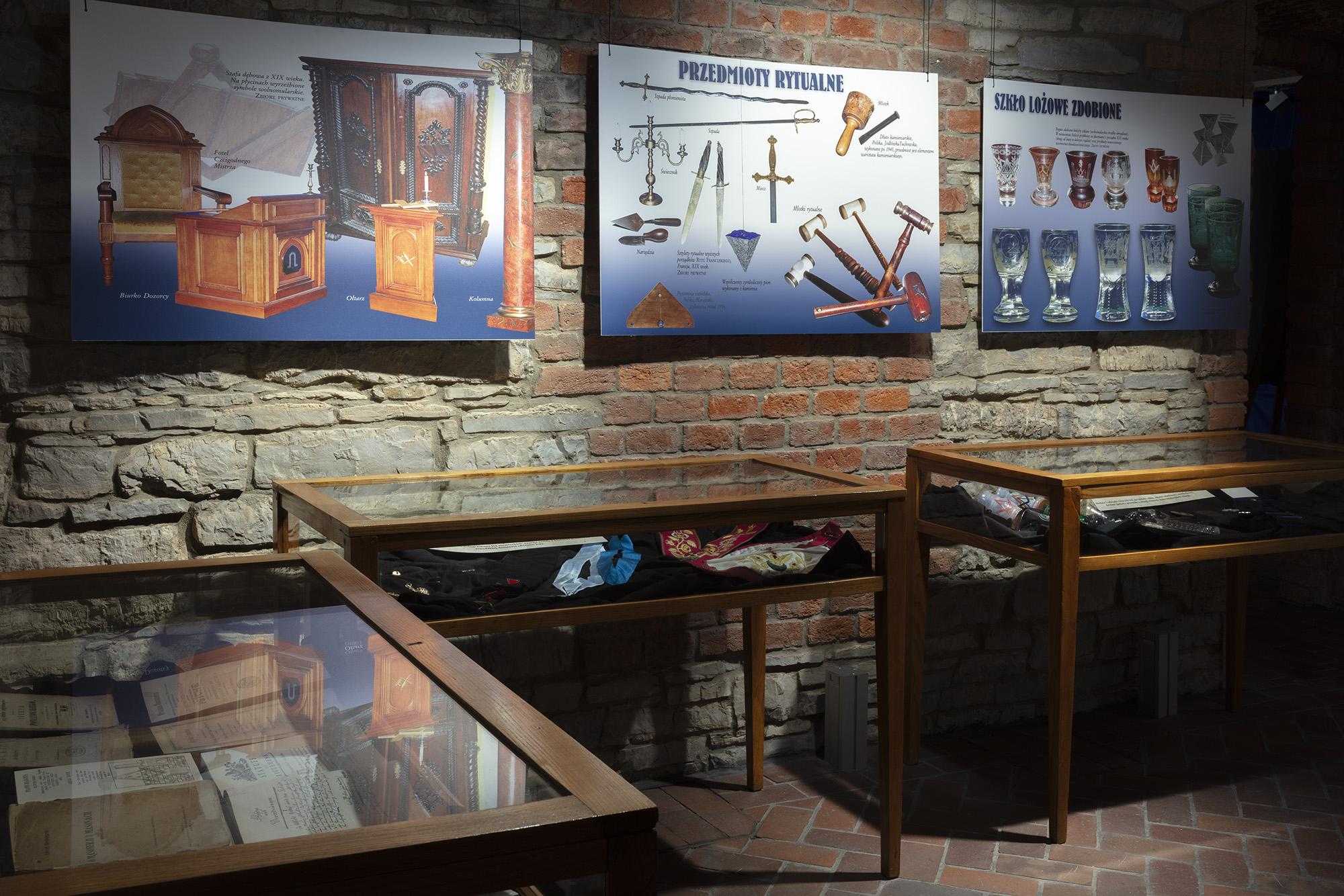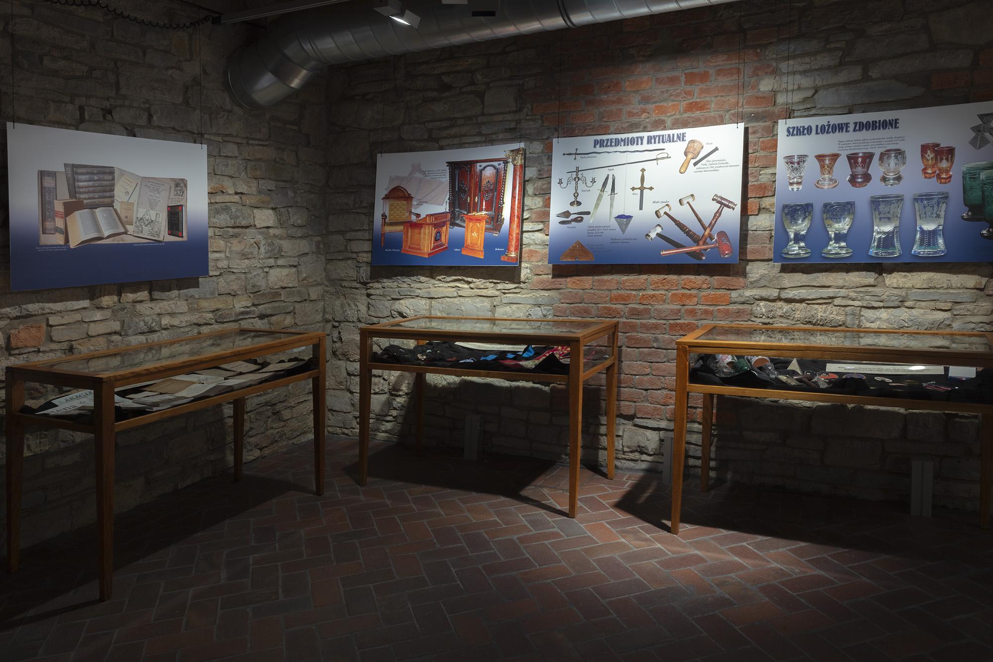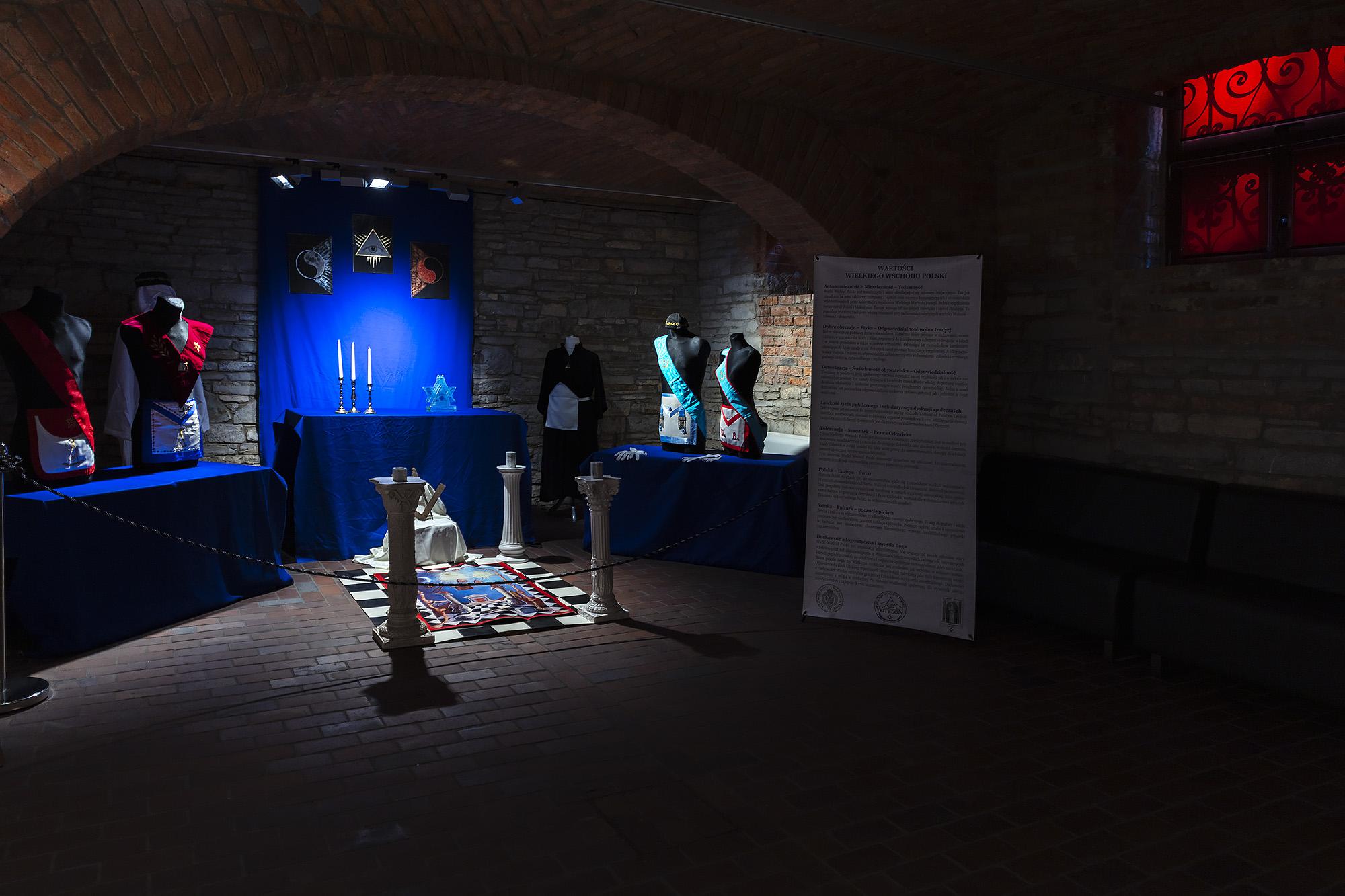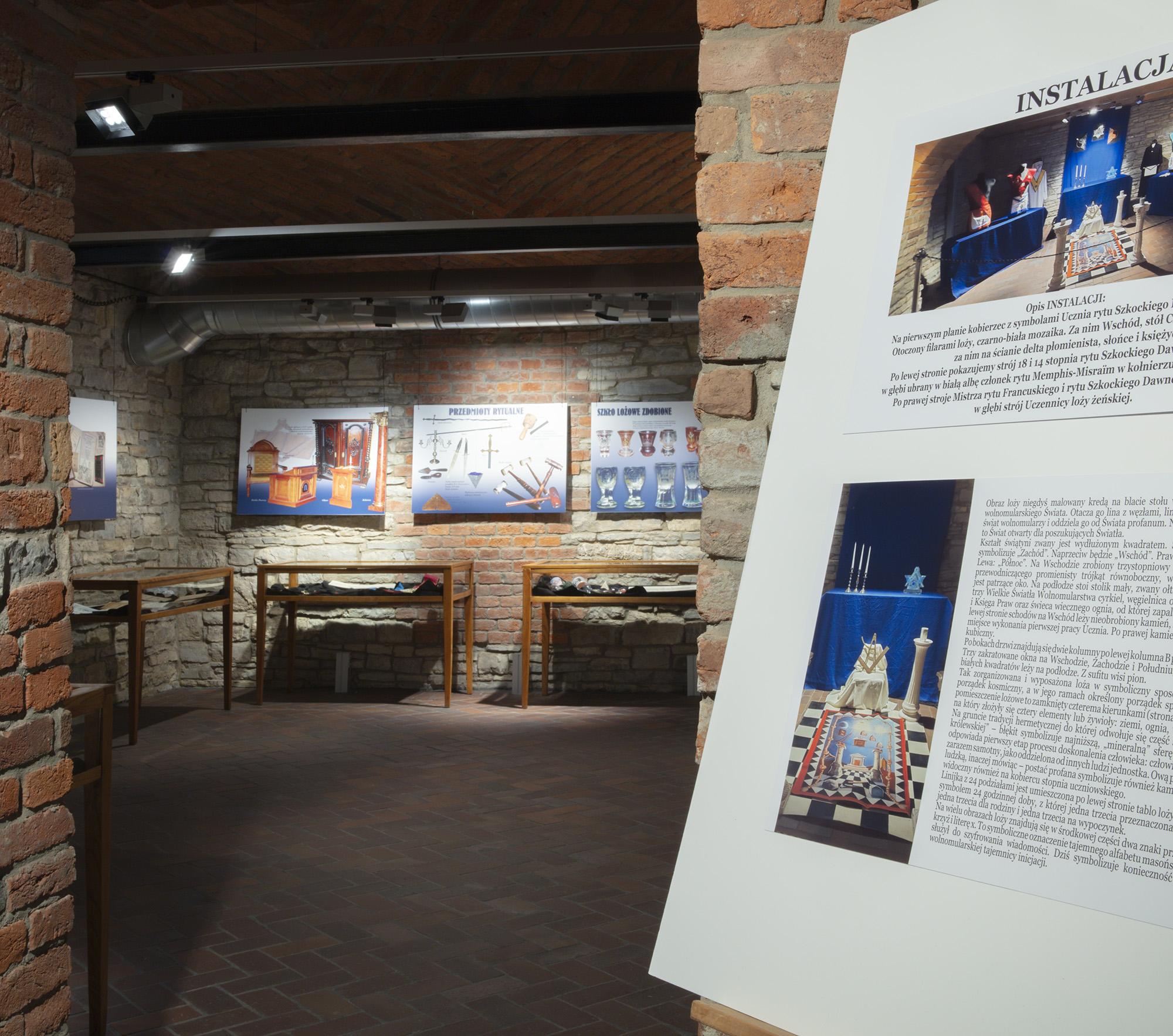 Zawiera plansze z informacjami historycznymi, poczet najważniejszych wolnomularzy polskich, informacje o symbolice i zasadach ruchu. Ilustracją są inscenizacje przybliżające zwiedzającym rytualne życie wolnomularzy. W gablotach pokazana jest polskojęzyczna literatura z XIX i pierwszej połowy XX wieku, przedmioty związane z subkulturą wolnomularstwa.